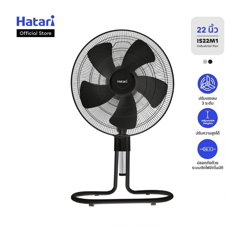 พัดลมอุตสาหกรรม Hatari รุ่น IS22M1 เป็นพัดลมแบบตั้งพื้น มาพร้อมใบพัดขนาดใหญ่ 22 นิ้ว ที่สามารถสร้างแรงลมได้อย่างทรงพลัง ควบคุมความแรงลมได้ 3 ระดับผ่านสวิตช์แบบปุ่มกดที่ใช้งานง่าย สามารถปรับส่ายซ้าย-ขวา หรือเลือกให้หยุดส่ายเพื่อส่งลมเฉพาะจุดได้ตามต้องการ ตัวพัดลมสามารถปรับระดับความสูงได้ตั้งแต่ 105.5 ถึง 118.5 เซนติเมตร เพื่อให้เหมาะกับทุกพื้นที่ใช้งาน โครงสร้างขาเสาและฐานพัดลมผลิตจากวัสดุคุณภาพสูง มีความแข็งแรงทนทานเป็นพิเศษ ด้านความปลอดภัยก็มั่นใจได้ด้วยระบบตัดไฟอัตโนมัติ เทอร์โมฟิวส์ (THERMAL FUSE) และยังใช้มอเตอร์ประสิทธิภาพสูงที่ทำงานด้วยระบบรองลื่นลูกปืน (Ball Bearing) ช่วยให้พัดลมทำงานเงียบและยืดอายุการใช้งาน ทั้งหมดนี้ผ่านกระบวนการผลิตที่ได้มาตรฐานระดับโลก ISO 14001 และมาตรฐานความปลอดภัย มอก. 934-2558