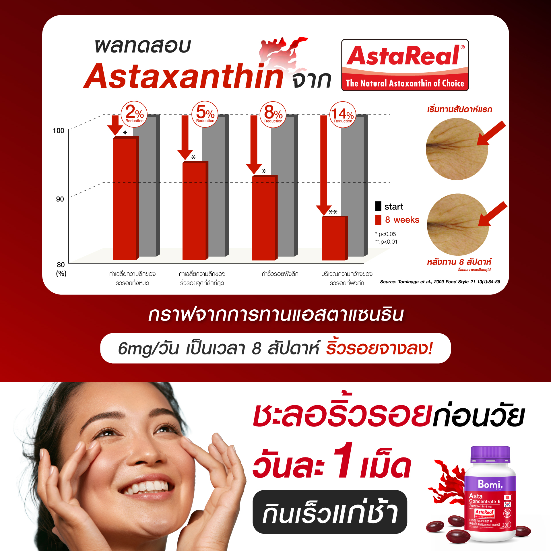 เคยไหม? ที่รู้สึกว่าผิวดูเหนื่อยล้า ไม่สดใส หรือกังวลกับสัญญาณแห่งวัยที่เริ่มมาเยือน Bomi Astaxanthin AstaReal Asta Concentrate 6 คือคำตอบของการดูแลสุขภาพและความงามจากภายในสู่ภายนอก ด้วยพลังแห่งแอสตาแซนธิน สารต้านอนุมูลอิสระSuper Antioxidant ที่ได้รับการยอมรับในระดับสากล ผสานกับเทคโนโลยี AstaReal อันเป็นเอกสิทธิ์ ทำให้มั่นใจได้ถึงคุณภาพและความเข้มข้นสูงสุด เพื่อผลลัพธ์ที่คุณจะรู้สึกได้จริง