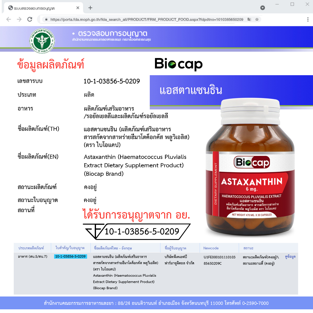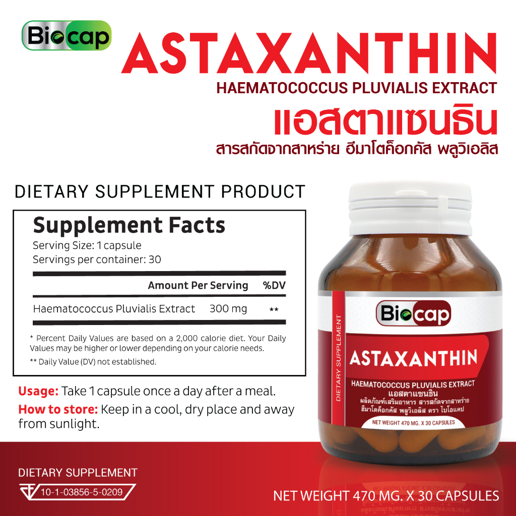 Biocap ไบโอแคป แอสตาแซนธิน 6 mg. Astaxanthin Haematococcus สาหร่ายสีแดง จากสารสกัดสาหร่ายฮีมาโตค็อกคัส พลูวิเอลิส แคปซูล Capsules 6 mg.