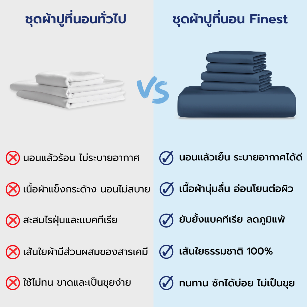 | สัมผัส | อาจมีความนุ่ม แต่บางครั้งก็กระด้าง | ✅ นุ่มลื่นดุจใยไหม อ่อนโยนต่อผิว |