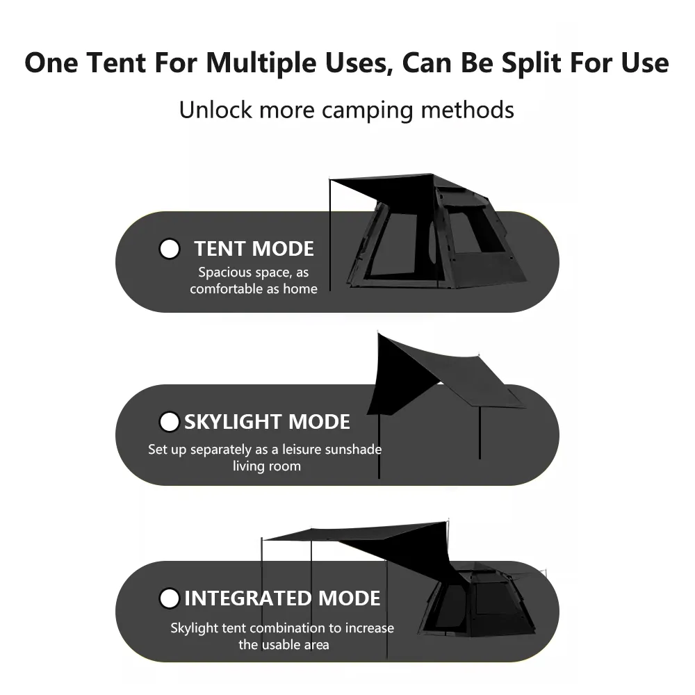 เต็นท์หนึ่งหลังสำหรับการใช้งานหลายอย่าง สามารถแยกและใช้งานได้ โดยปลดล็อกสามโหมด: โหมดเต็นท์ โหมดหลังคา โหมดเต็นท์หลังคา