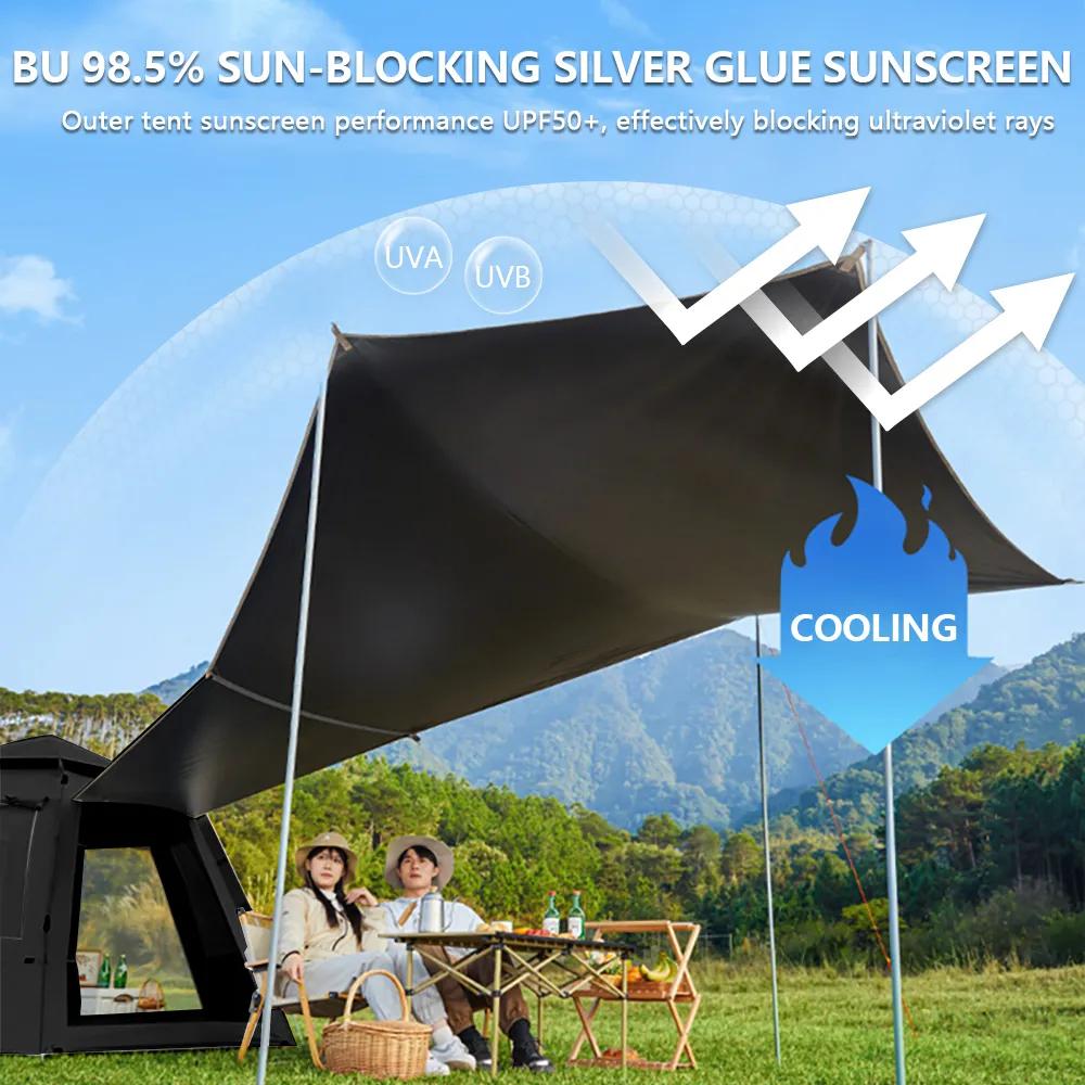 การป้องกันแสงแดดด้วยกาวเงิน "BU" 98.5% ประสิทธิภาพการป้องกันแสงแดดของเต็นท์ภายนอก UPF สามารถเข้าถึง 50+ ได้อย่างมีประสิทธิภาพ ป้องกันรังสีอัลตราไวโอเลต ระบายความร้อนและความร้อนได้อย่างมีประสิทธิภาพ
