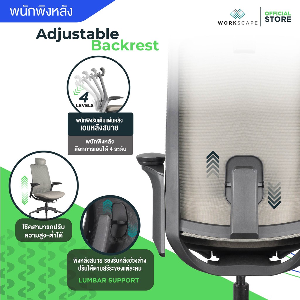| ที่รองรับหลัง (Lumbar Support) | ปรับความสูง (ขึ้น-ลง) ได้ | รองรับส่วนโค้งเว้าของหลังส่วนล่าง (Lumbar) ได้พอดี ช่วยให้กระดูกสันหลังอยู่ในแนวธรรมชาติ |