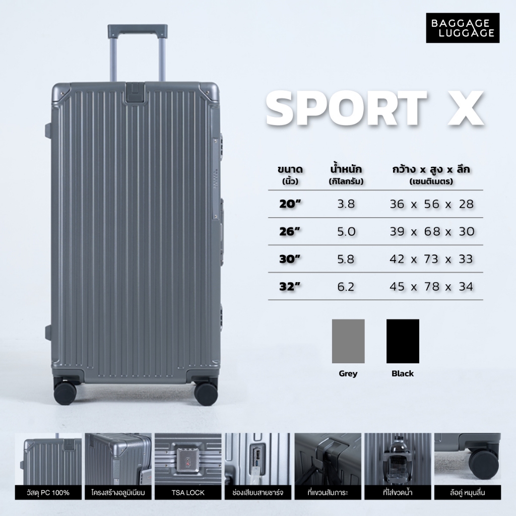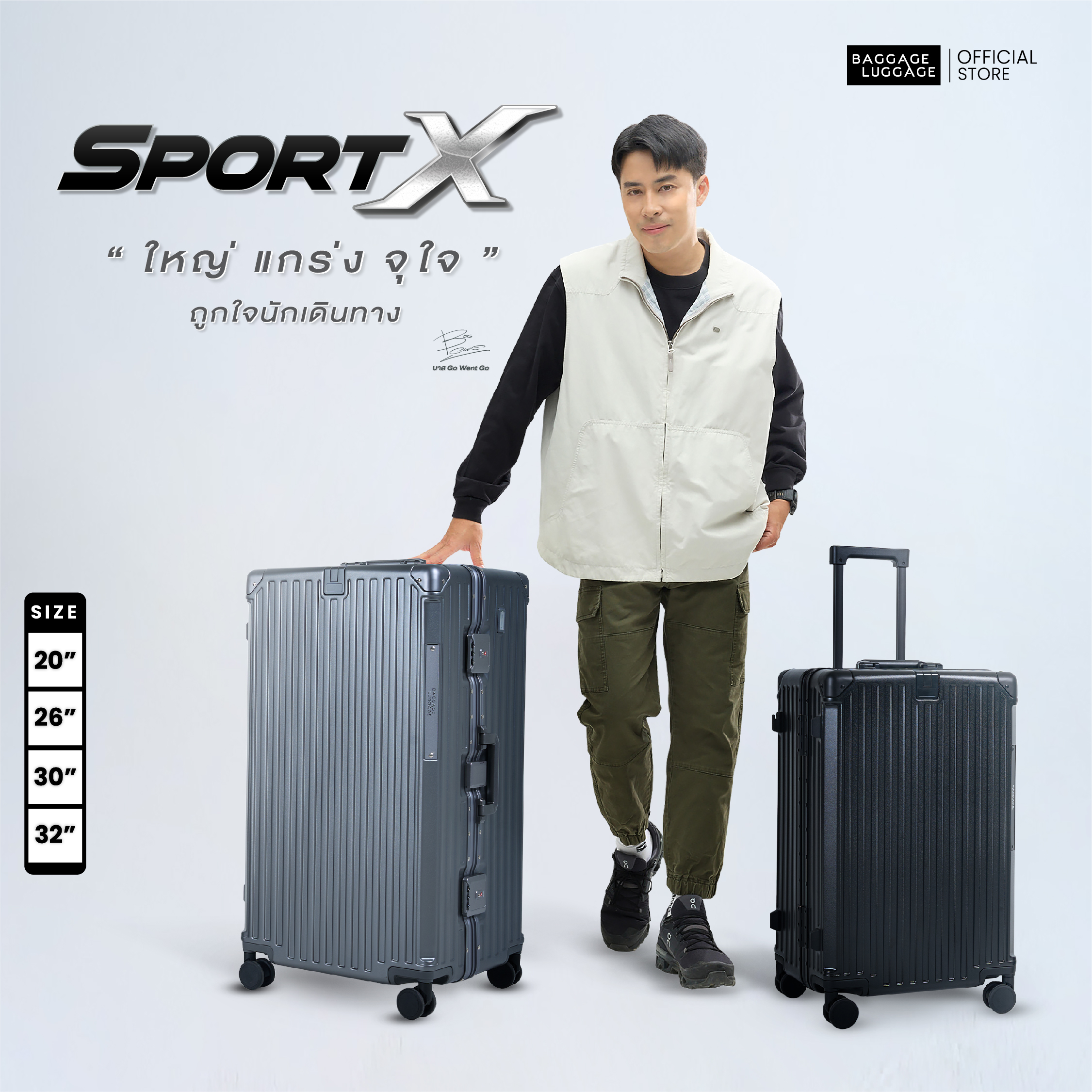 ขอแนะนำ SportX Series กระเป๋าเดินทางคอลเลกชันใหม่ล่าสุดจาก BAGGAGE LUGGAGE ที่มาพร้อมดีไซน์ทรงถัง (Trunk-Style) สุดเอ็กซ์คลูซีฟ โดดเด่นไม่เหมือนใครด้วยรูปลักษณ์ที่สวยงามดุดันและทรงพลัง พร้อมลุยไปกับคุณในทุกการผจญภัย ตัวกระเป๋าผลิตจากวัสดุโพลีคาร์บอเนต (PC) เกรดพรีเมียม ซึ่งขึ้นชื่อเรื่องความยืดหยุ่นสูงและทนทานต่อแรงกระแทกได้ดีเยี่ยม เสริมความแข็งแกร่งอีกขั้นด้วยโครงอลูมิเนียม ปกป้องสัมภาระของคุณได้อย่างมั่นใจ