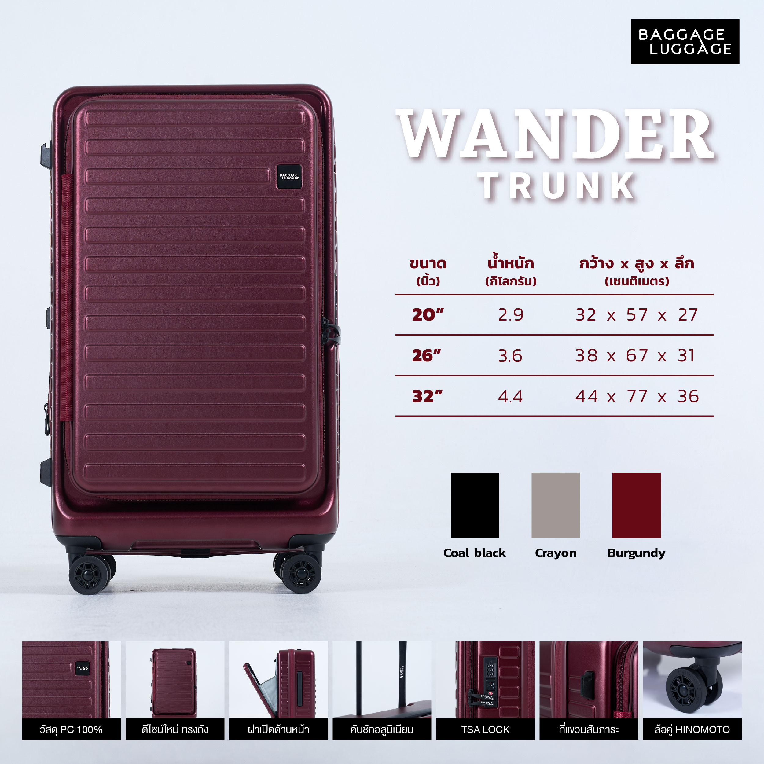 | ฟังก์ชัน | กระเป๋าเดินทางทั่วไป (แบบฝาผีเสื้อ) | Baggage Luggage รุ่น WANDER TRUNK |