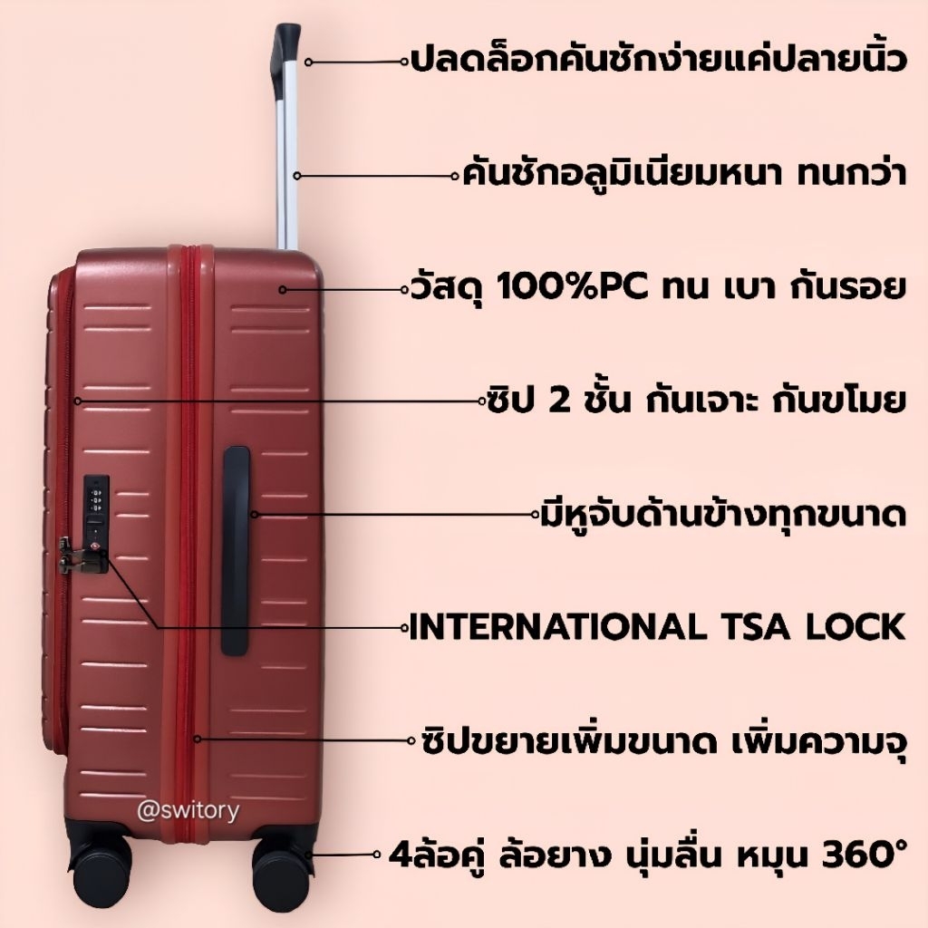 กระเป๋าเดินทาง SWITORY รุ่น Anti117 facelift เป็นรุ่น TOP ที่สุด ผลิตจากวัสดุ PC 100% ซึ่งมีความทนทานและยืดหยุ่นสูง โดดเด่นด้วยดีไซน์เปิดฝาหน้า สะดวกต่อการหยิบใช้งานโน้ตบุ๊กและสัมภาระ มาพร้อมคุณสมบัติด้านความปลอดภัยขั้นสูงด้วยระบบล็อกมาตรฐานสากล TSA Lock และซิป 2 ชั้นที่ออกแบบมาเพื่อป้องกันการเจาะโดยเฉพาะ นอกจากนี้ยังมีซิปขยายเพื่อเพิ่มพื้นที่จัดเก็บได้อีกด้วย ระบบล้อเป็นแบบล้อคู่ 4 ล้อ ทำจากยางคุณภาพดี ทำให้การเคลื่อนไหวลื่นไหล นุ่มนวล และเงียบเชียบ คันชักอลูมิเนียมถูกออกแบบให้ฝังในกระเป๋าเพื่อความแข็งแรงและป้องกันการเสียหาย