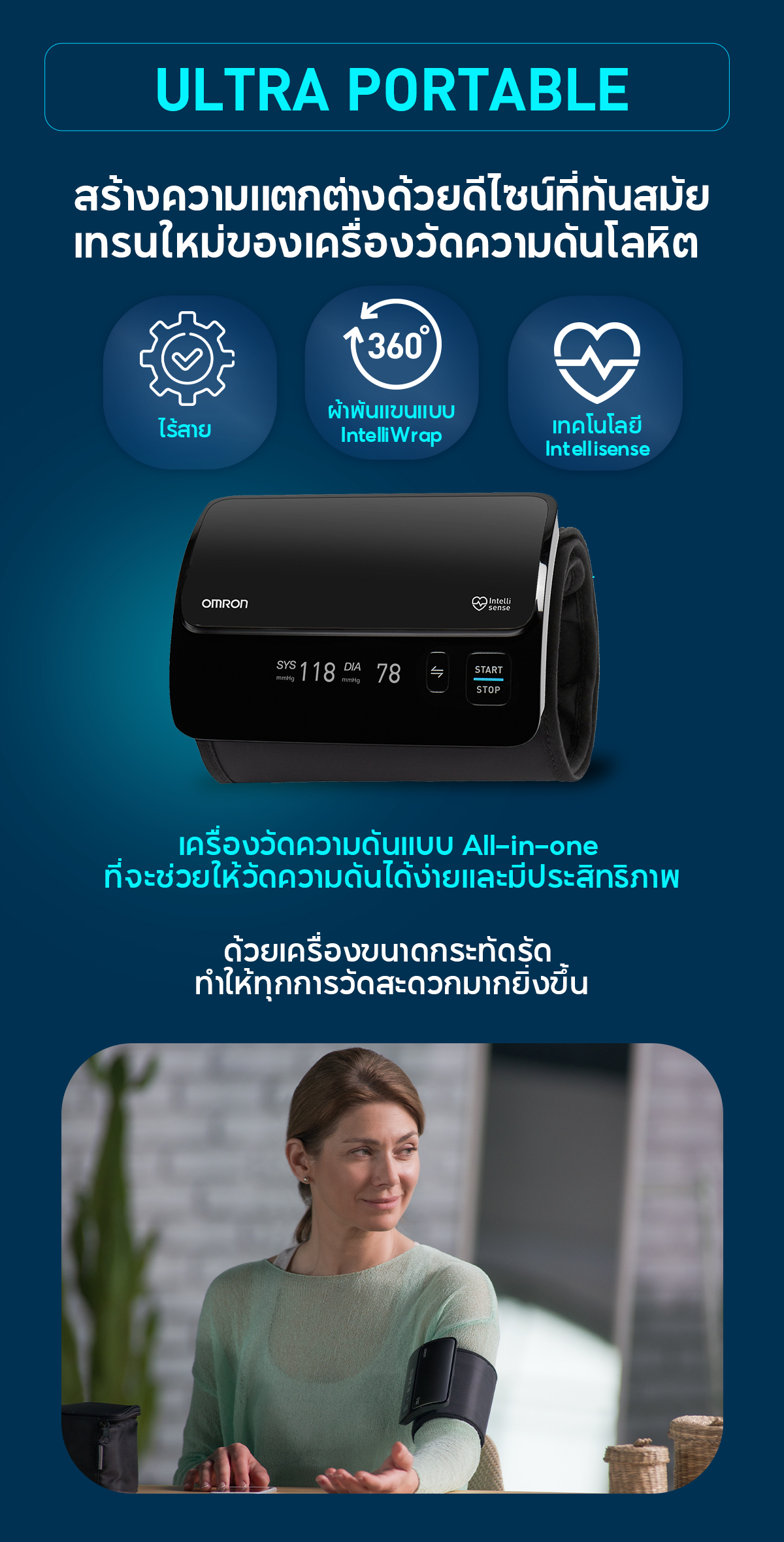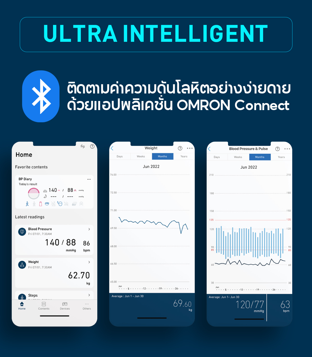 OMRON Blood Pressure Monitor HEM-7600T เป็นเครื่องวัดความดันโลหิตแบบไร้สายระบบ Intellisense เทคโนโลยีที่ช่วยให้การวัดความดันรวดเร็วขึ้นและบีบต้นแขนน้อยกว่า พร้อมเพิ่มความดันลมให้เหมาะสมกับแต่ละบุคคล น้ำหนักเบา พกพาสะดวก ครบถ้วนด้วยฟังก์ชั่น มีสัญลักษณ์แสดงเมื่อความดันโลหิตเกินมาตรฐานหรือเมื่อตรวจจับการเต้นของหัวใจที่ผิดปกติ เชื่อมต่อข้อมูลสุขภาพได้ง่ายผ่านแอปพลิเคชั่น Omron Connect