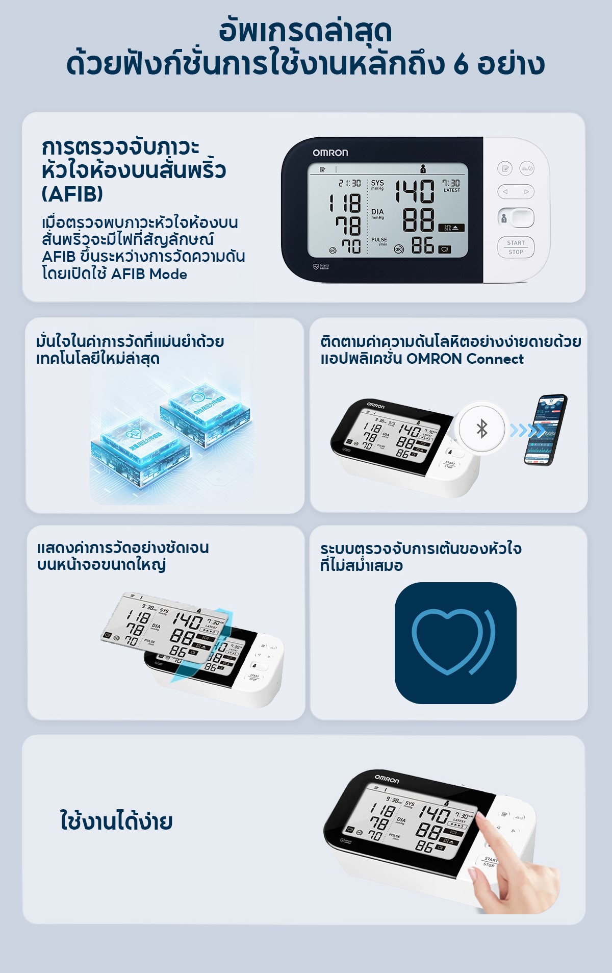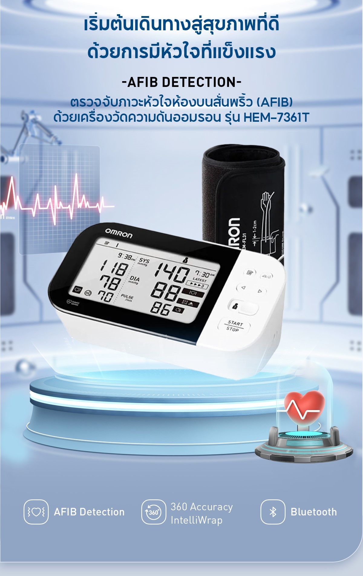 ตรวจหาภาวะหัวใจห้องบนสั่นพลิ้วในระหว่างการวัดความดันโลหิตได้ง่ายๆ ที่บ้านตลอดเวลาด้วย HEM-7361T ที่มีเทคโนโลยีตรวจหา AFib ที่ล้ำสมัยประกอบด้วยคุณลักษณะเด่นอื่นๆ อีกมากมาย เครื่องจะเตือนความผิดปกติของ AFib ในจังหวะการเต้นของหัวใจให้คุณทราบทันที ทำให้คุณสามารถรับการรักษาจากแพทย์ได้อย่างทันท่วงที