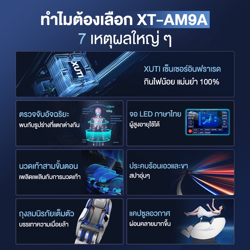 | คุณสมบัติ | เก้าอี้นวดไฟฟ้ารุ่นทั่วไป | XUTI รุ่น XTAM9 (รุ่นนี้) |