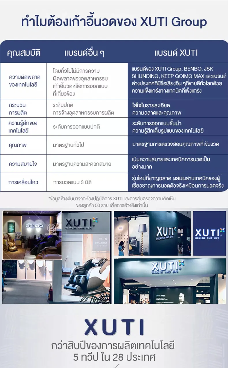ในฐานะผู้เชี่ยวชาญด้านผลิตภัณฑ์เพื่อสุขภาพและการผ่อนคลาย ขอสรุปว่า XUTI AMR1S เป็นเก้าอี้นวดไฟฟ้าที่โดดเด่นด้วยเทคโนโลยี Zero Gravity และโปรแกรมการนวดที่หลากหลาย ซึ่งถูกออกแบบมาเพื่อมอบประสบการณ์การผ่อนคลายที่เหนือกว่าอย่างแท้จริง ตั้งแต่ระบบสแกนร่างกายอัจฉริยะที่ปรับการนวดให้เข้ากับสรีระเฉพาะบุคคล หัวนวดกลีบดอกไม้ 3 มิติที่ให้สัมผัสนุ่มนวลแต่ทรงพลัง ไปจนถึงรีโมทคอนโทรลภาษาไทยที่ใช้งานง่าย ทำให้ XUTI AMR1S เป็นมากกว่าเก้าอี้นวดทั่วไป แต่เป็นเหมือนผู้ช่วยดูแลสุขภาพส่วนตัวที่บ้านของคุณอย่างแท้จริง อย่าลังเลที่จะยกระดับคุณภาพชีวิตและความผ่อนคลายของคุณตั้งแต่วันนี้! จำนวนจำกัด! รีบกดสั่งซื้อเลย!