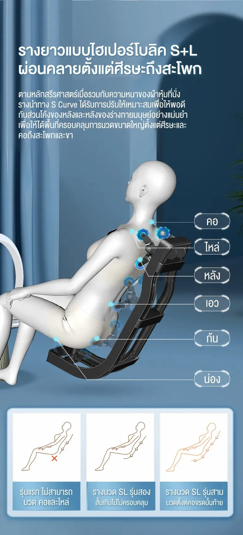 | รางนวด | S-Track หรือ L-Track สั้นๆ | 🚀 SL-Track ยาวพิเศษ 145 ซม. (คอถึงต้นขา) |