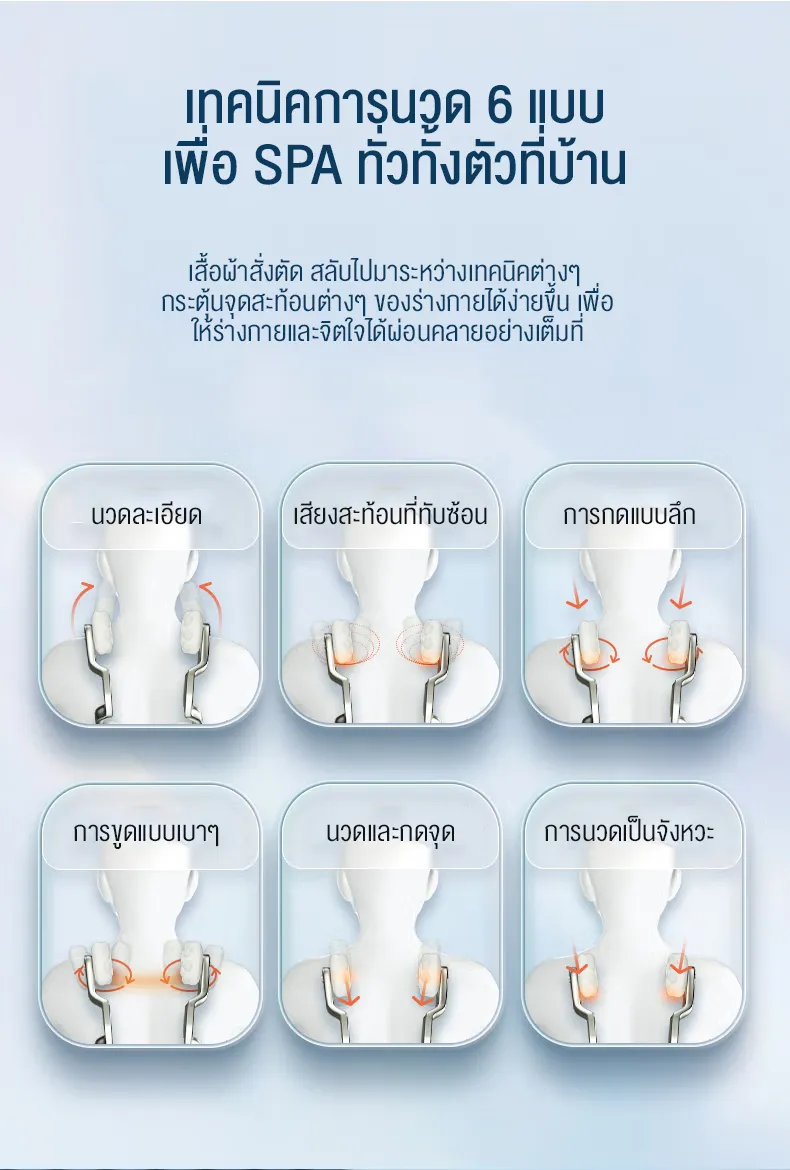 · ส่วนที่นวด: แขน, คอ, หลัง, เอว, ก้น, ขาและเท้า
