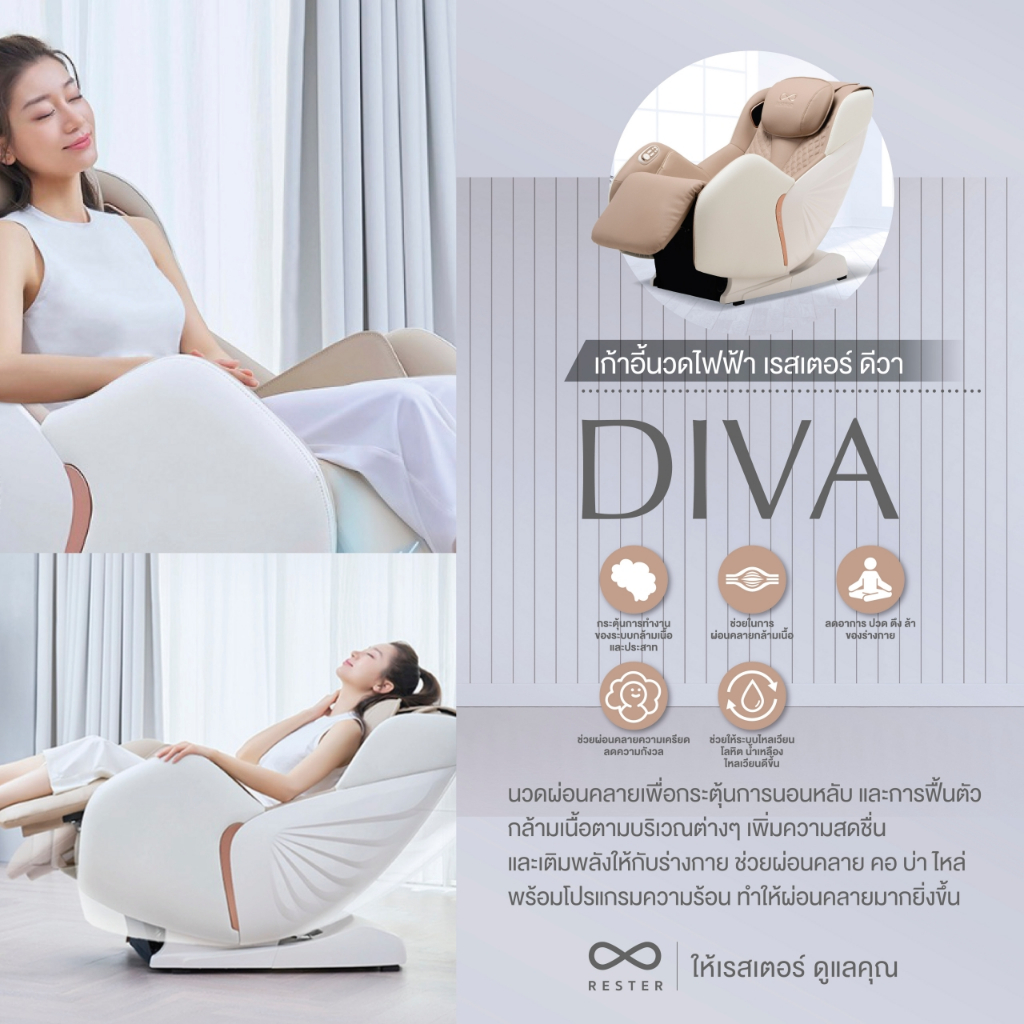 Rester Diva เก้าอี้นวดไฟฟ้า ปรับตำแหน่งการนวด กระตุ้นการไหลเวียนโลหิตนวดแบบผสมผสาน ผ่อนคลายกล้ามเนื้อ ลดอาการปวดเมื่อย เสริมความผ่อนคลายขั้นสุด เก้าอี้เบาะนุ่ม ลดอาการปวดเมื่อย