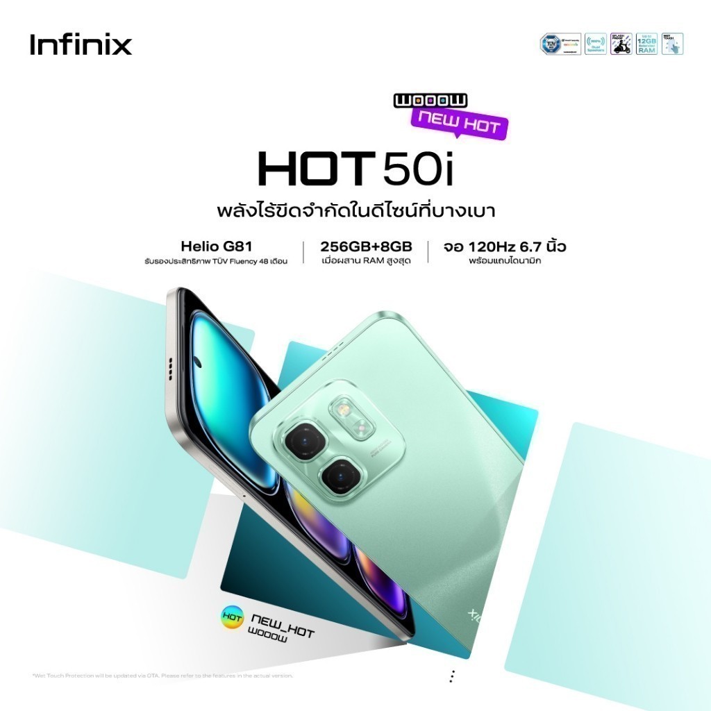 Infinix รุ่น HOT 50i สมาร์ทโฟนจอใหญ่ 6.7 นิ้ว 120Hz RAM 8GB ชิป Helio G81 แบตเตอรี่ 5000mAh รองรับชาร์จเร็ว 18W