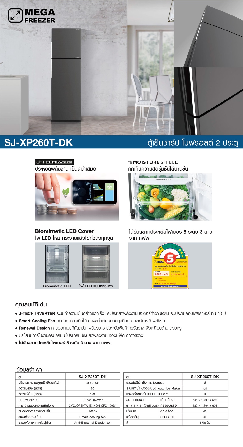 ผลิตภัณฑ์ตู้เย็น SHARP รุ่น SJ-XP230T-DK และ SJ-XP260T-DK ได้รับการออกแบบภายใต้แนวคิด Renewal Design ที่เน้นความเรียบหรูและทันสมัยด้วยผิวสัมผัสแบบด้านสีเงินเข้ม (Dark Silver) ซึ่งช่วยลดรอยนิ้วมือและเข้าได้กับทุกสไตล์การตกแต่งห้องครัว จุดเด่นสำคัญอยู่ที่ระบบ J-Tech Inverter ซึ่งเป็นเทคโนโลยีขั้นสูงที่ช่วยควบคุมอุณหภูมิได้อย่างแม่นยำ เดินเครื่องเงียบ และประหยัดพลังงานสูงสุด การันตีด้วยฉลากประหยัดไฟเบอร์ 5 ระดับ 3 ดาว จากการไฟฟ้าฝ่ายผลิตแห่งประเทศไทย (กฟผ.) ผสานการทำงานร่วมกับระบบ Smart Cooling Fan ที่กระจายความเย็นได้อย่างสม่ำเสมอรอบทิศทาง ทำให้อาหารสดใหม่ยาวนานขึ้น นอกจากนี้ยังออกแบบให้มีช่องแช่แข็งขนาดใหญ่ (MEGA Freezer) เพื่อรองรับวิถีชีวิตของครอบครัวยุคใหม่ที่ต้องการพื้นที่จัดเก็บมากขึ้น