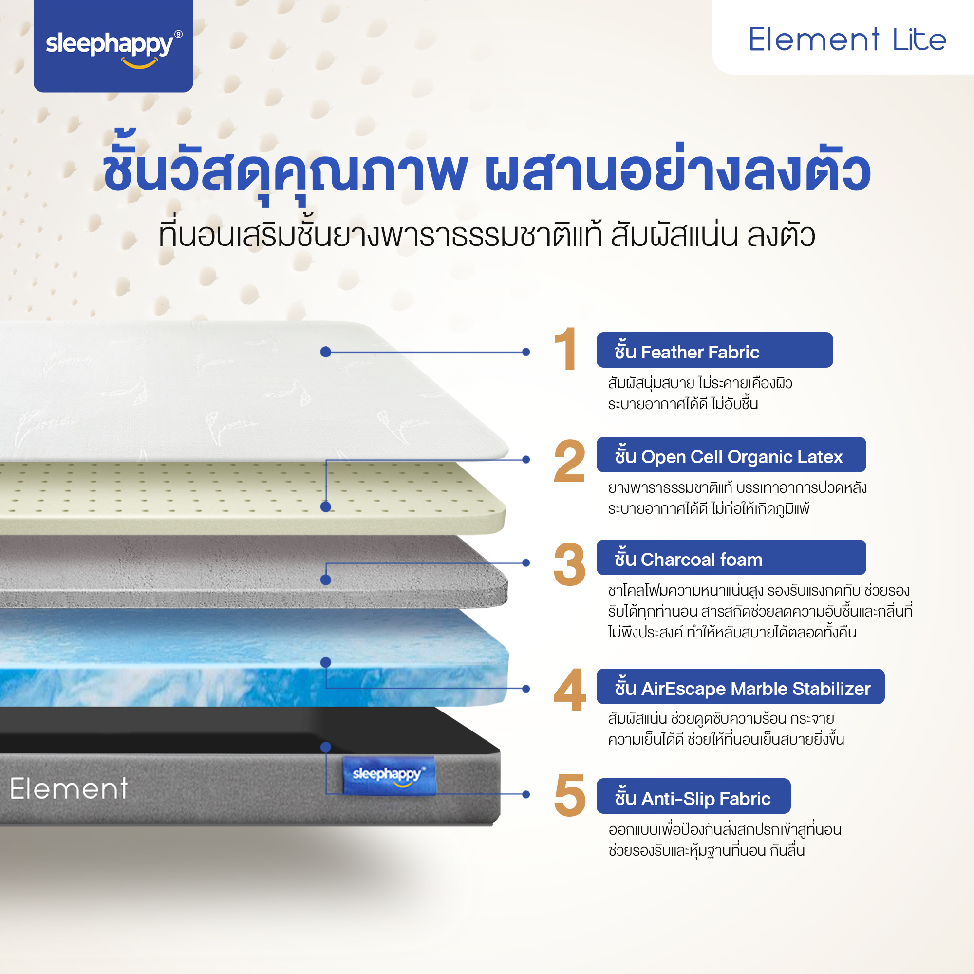 SleepHappy ที่นอนยางพาราแท้ รุ่น Element Lite คือคำตอบของการพักผ่อนที่เหนือระดับ อัปเกรดใหม่ด้วยการนำยางพาราธรรมชาติแท้ 100% ที่ผ่านกระบวนการสกัดโปรตีนออก ทำให้ได้ที่นอนคุณภาพสูง ไร้กลิ่นยางกวนใจ มอบสัมผัสแน่นกำลังดี ผสานนวัตกรรม Charcoal Foam ที่ช่วยดูดซับความชื้นและลดกลิ่นอับได้อย่างยอดเยี่ยม ที่นอนรุ่นนี้ถูกออกแบบมาเพื่อรองรับสรีระและจัดเรียงแนวกระดูกสันหลังให้ถูกต้องตามหลักสรีรศาสตร์ จึงช่วยบรรเทาอาการปวดหลังและออฟฟิศซินโดรมได้อย่างมีประสิทธิภาพ ทั้งยังระบายอากาศได้ดีเยี่ยม ช่วยป้องกันการสะสมของไรฝุ่น เชื้อรา และแบคทีเรีย ซึ่งเป็นสาเหตุของโรคภูมิแพ้