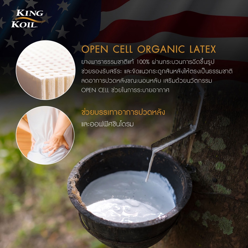 ตามมาด้วยชั้น Open cell Organic Latex หรือยางพาราธรรมชาติแท้ที่มีรูระบายอากาศนับล้าน ช่วยให้อากาศไหลเวียนสะดวก ป้องกันความอับชื้น และที่สำคัญคือความยืดหยุ่นของยางพาราที่โอบรับทุกส่วนโค้งของร่างกายได้อย่างสมบูรณ์แบบ และปิดท้ายด้วย Cool Gel Memory Foam นวัตกรรมจาก Nasa ที่นำเม็ดบีดส์คูลเจลมาผสมในเมมโมรี่โฟม ช่วยดูดซับและระบายความร้อนออกจากร่างกาย ทำให้คุณรู้สึกเย็นสบายตลอดทั้งคืน บอกลาปัญหาการนอนหลับไม่สนิทเพราะอากาศร้อนไปได้เลย