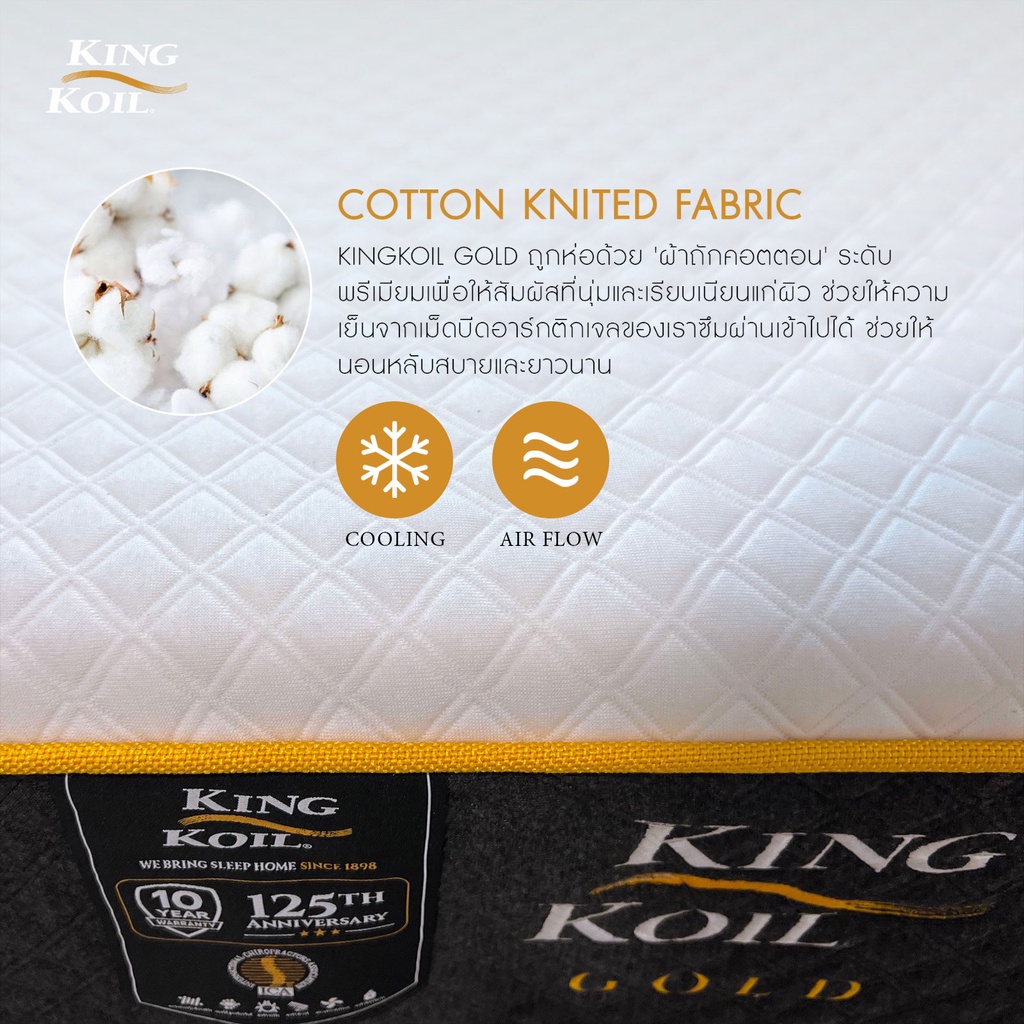ข้อมูลสินค้า : สัมผัสประสบการณ์การนอนหลับเหนือระดับกับ KingKoil รุ่น Gold ที่นอนที่ผสานเทคโนโลยีที่ดีที่สุดเพื่อการพักผ่อนอย่างแท้จริง ด้วยความหนา 9 นิ้วที่ให้สัมผัสนุ่มสบายกำลังดี มาพร้อมโครงสร้างคุณภาพที่คัดสรรมาอย่างพิถีพิถัน
