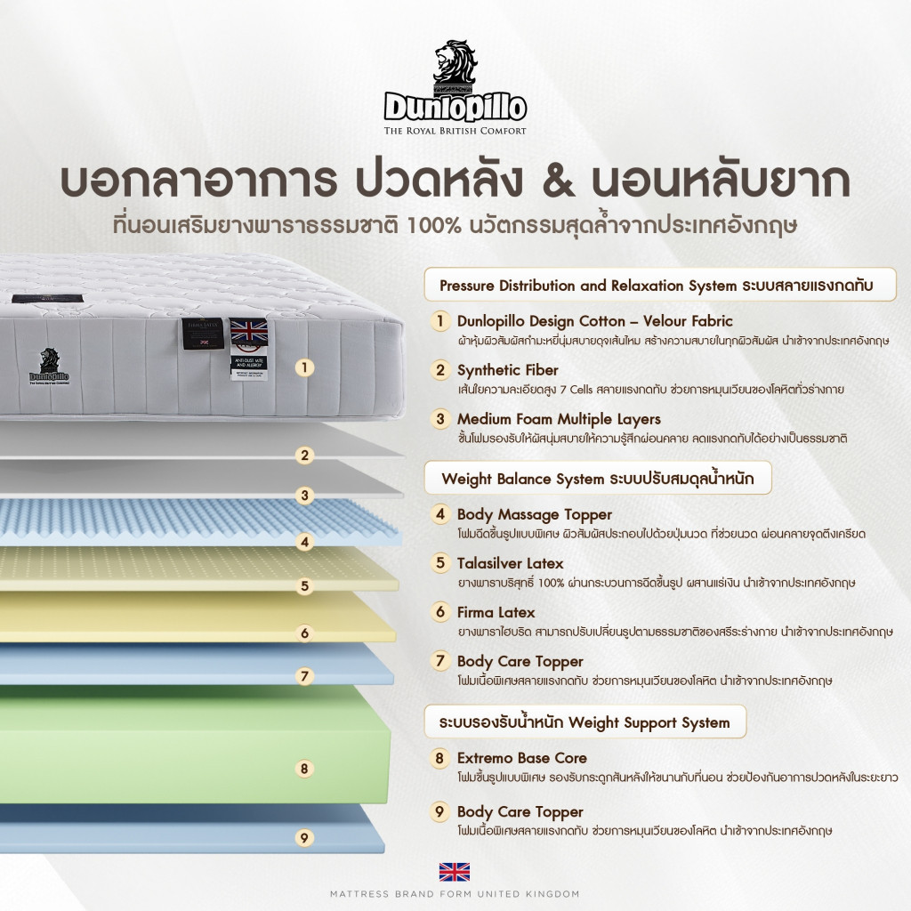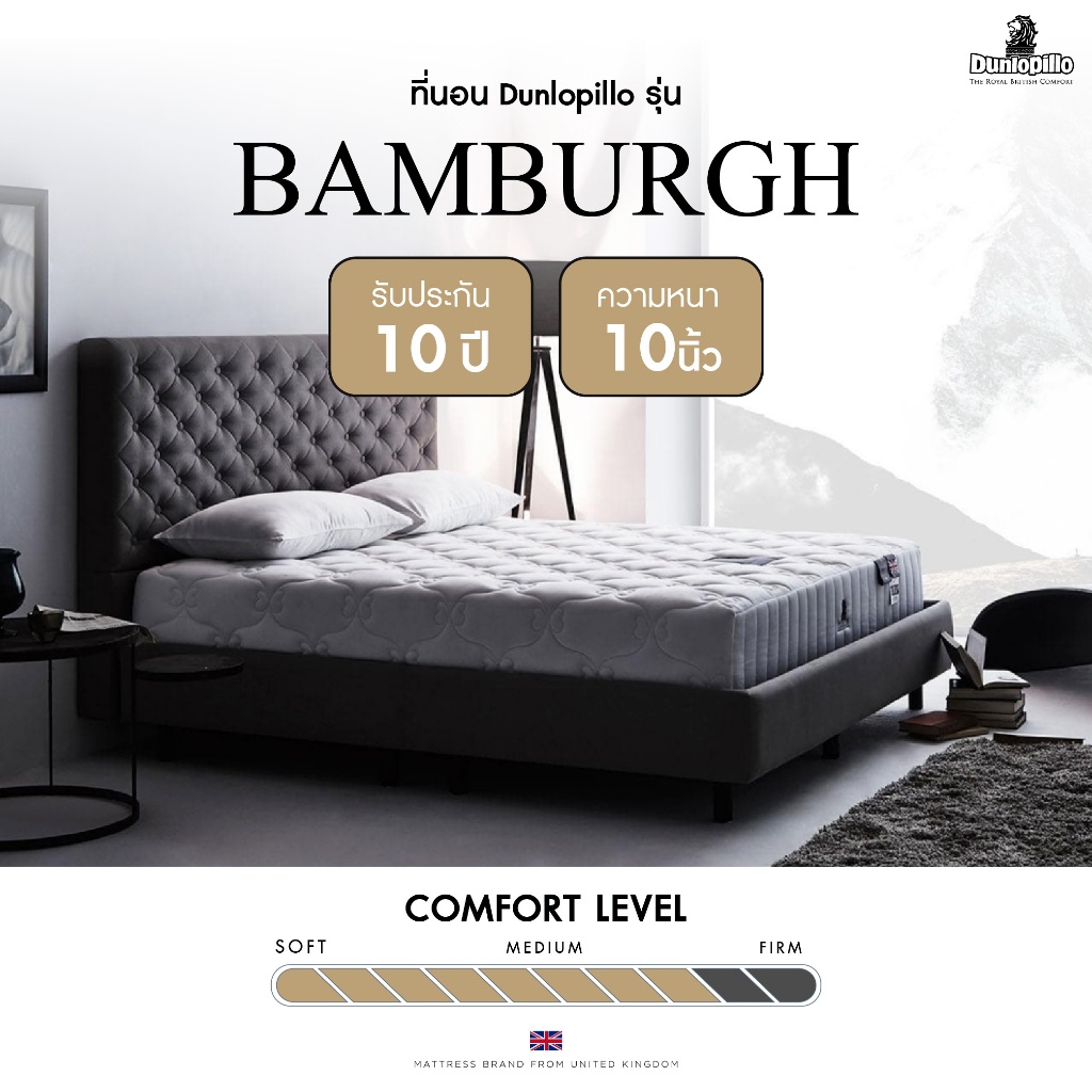ในฐานะผู้เชี่ยวชาญด้านเครื่องนอนเพื่อสุขภาพ เราสามารถยืนยันได้ว่า Dunlopillo รุ่น Bamburgh คือหนึ่งในตัวเลือกที่สมบูรณ์แบบที่สุดสำหรับผู้ที่มองหาการพักผ่อนที่มีคุณภาพและการลงทุนเพื่อสุขภาพในระยะยาว ด้วยการผสมผสานยางพาราแท้เกรดพรีเมียมจากอังกฤษ นวัตกรรมลดอาการปวดหลังและภูมิแพ้ ทำให้ที่นอนรุ่นนี้โดดเด่นและแตกต่าง ที่เว็บของเรา คุณสามารถตรวจสอบอันดับความนิยมและยอดขายแบบ real-time ได้เสมอเพื่อความมั่นใจสูงสุด ตอนนี้เป็นโอกาสดีที่สุดในการเป็นเจ้าของ เพราะมีโปรโมชั่นพิเศษและของแถมสุดคุ้ม อย่าลังเลที่จะมอบการนอนหลับที่ดีที่สุดเป็นของขวัญให้ตัวเองและคนที่คุณรัก กดสั่งซื้อเลย!