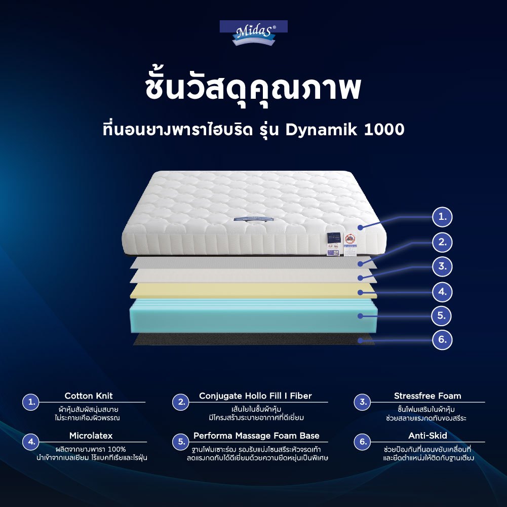 Midas รุ่น Dynamik 1000 ไม่ใช่แค่ที่นอน แต่เป็นนวัตกรรมเพื่อการนอนหลับอย่างมีคุณภาพ เอกลักษณ์ที่โดดเด่นที่สุดคือการเป็น ที่นอนยางพาราไฮบริด ที่รวมข้อดีของวัสดุแต่ละชนิดไว้ด้วยกันอย่างสมบูรณ์แบบ โดยมีแกนกลางเป็น Microlatex ยางพาราธรรมชาติแท้จากประเทศเบลเยี่ยมที่ผ่านกระบวนการอัดแน่นพิเศษ ทำให้ได้ที่นอนที่มีความแน่น แต่มิได้กระด้าง กลับให้ความยืดหยุ่นและรองรับน้ำหนักได้ดีเยี่ยม ทนทาน ไม่ยุบตัวง่าย