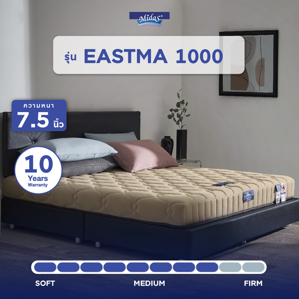 สัมผัสประสบการณ์การนอนที่เหนือกว่ากับ Midas ที่นอนยางพาราแท้ รุ่น Eastma 1000 ที่นอนที่ถูกออกแบบมาเพื่อสุขภาพการนอนที่ดีที่สุดของคุณ เราใส่ใจในทุกรายละเอียดโดยสั่งผลิตใหม่ทุกออเดอร์ คุณจึงมั่นใจได้ว่าจะได้รับสินค้าใหม่ ไม่ค้างสต็อก พร้อมการรับประกันโครงสร้างภายในยาวนานถึง 10 ปี (สามารถลงทะเบียนออนไลน์ได้สะดวก)