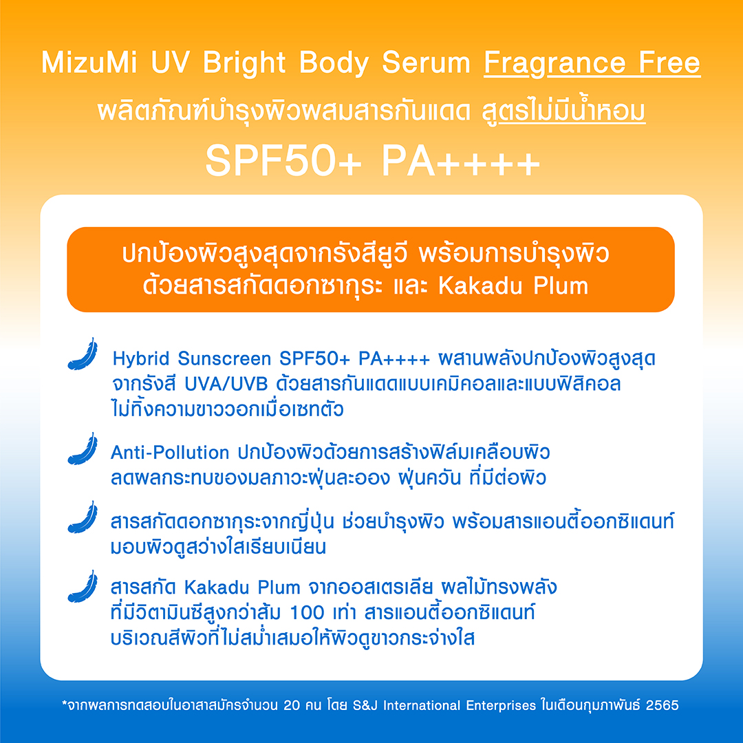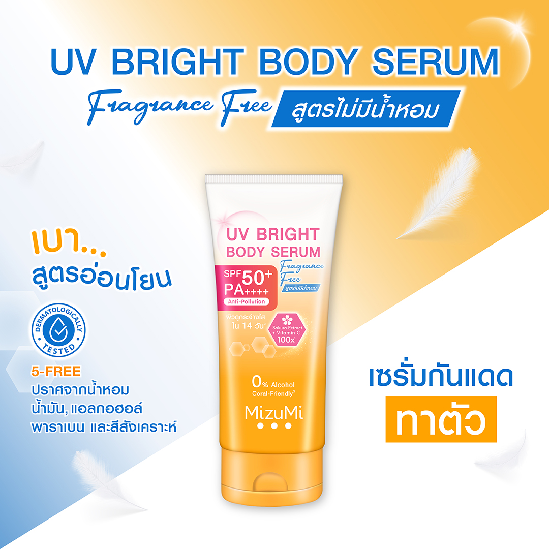 เวลาเป็นเงินเป็นทอง ไม่อยากอ่านยาวๆ ใช่ไหม? จัดให้เลย! สรุปสั้นๆ สำหรับคนใจร้อน MizuMi UV Bright Body Serum คือเซรั่มกันแดดทาตัวเนื้อบางเบาเหมือนน้ำ ซึมเข้าผิวทันทีที่ทา ไม่ทิ้งความเหนียวเหนอะหนะหรือคราบขาวกวนใจแม้แต่น้อย มาพร้อมค่ากันแดดสูงสุด SPF50+ PA++++ ช่วยปกป้องผิวจากรังสี UVA และ UVB ได้อย่างเต็มประสิทธิภาพ แถมยังช่วยบำรุงให้ผิวดูกระจ่างใสขึ้นด้วยสารสกัดจากดอกซากุระและวิตามินซี ที่สำคัญคือ “ไม่มีน้ำหอม” อ่อนโยนต่อทุกสภาพผิว แม้แต่ผิวแพ้ง่ายก็ใช้ได้สบายๆ สรุปง่ายๆ คือเป็นกันแดดที่ทำหน้าที่เกราะป้องกันผิวชั้นเยี่ยม พร้อมบำรุงผิวให้สวยขึ้นในตัวเดียว จบ ครบในขวดนี้! แต่ถ้าอยากรู้ว่าทำไมมันถึงดีงามขนาดนี้ และมีอะไรซ่อนอยู่ในนั้นอีกบ้าง เลื่อนลงไปอ่านรายละเอียดแบบจัดเต็มข้างล่างต่อได้เลย รับรองว่าคุ้มค่าทุกนาทีที่อ่าน!