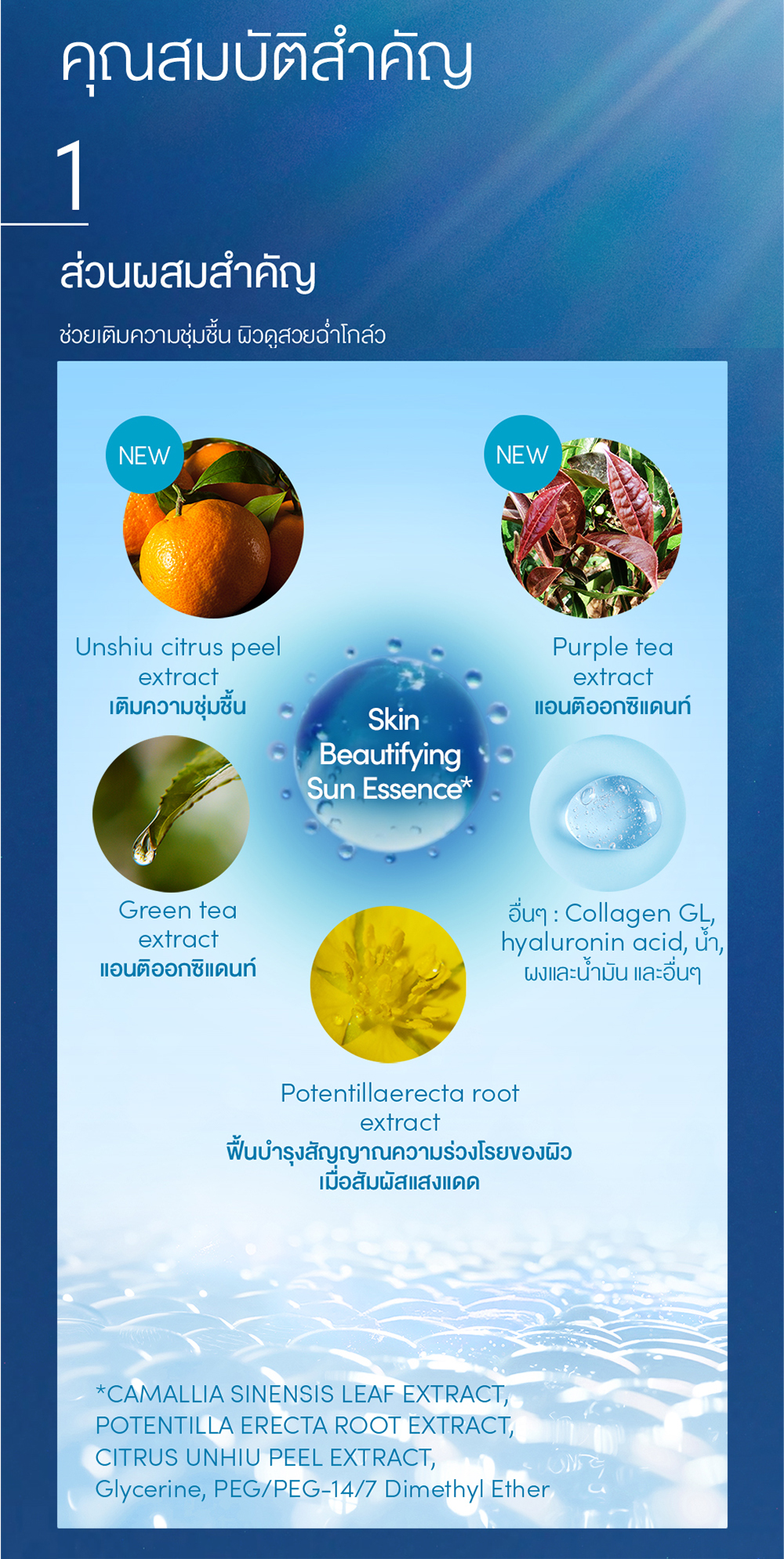 ส่วนประกอบสำคัญ: Water, Alcohol, Dimethicone, Diisopropyl Sebacate, Octocrylene, Ethylhexyl Salicylate, Homosalate, Titanium Dioxide, C12-15 Alkyl Benzoate, Bis-Ethylhexyloxyphenol Methoxyphenyl Triazine, Diethylamino Hydroxybenzoyl Hexyl Benzoate, Glycerin, Caprylyl Methicone, PEG-60 Hydrogenated Castor Oil, Butylene Glycol, Ethylhexyl Triazone, Trimethylsiloxysilicate, Acrylamides/Dmapa Acrylates/Methoxy PEG Methacrylate Copolymer, Hydrogenated Palm Oil, Isododecane, Hydrated Silica, Phenoxyethanol, Bis-Butyldimethicone Polyglyceryl-3, Polyglyceryl-6 Polyricinoleate, Elaeis Guineensis Kernel Oil, Triethoxycaprylylsilane, Elaeis Guineensis Oil, Carbomer, Potassium Hydroxide, Agar, Dextrin Palmitate/Ethylhexanoate, Xanthan Gum, Acrylates/C10-30 Alkyl Acrylate Crosspolymer, Tocopherol, BHT, Fragrance, Hydroxypropyl Methylcellulose Stearoxy Ether, Distearyldimonium Chloride, Dextrin Palmitate, PEG/PPG-14/7 Dimethyl Ether, PEG/PPG-9/2 Dimethyl Ether, Stearic Acid, PEG-6, Sodium Metabisulfite, Silica, Dipotassium Glycyrrhizate, Camellia Sinensis Leaf Extract, Potentilla Erecta Root Extract, Citrus Unshiu Peel Extract, Sodium Acetylated Hyaluronate, Synthetic Fluorphlogopite, Citric Acid, Soluble Collagen