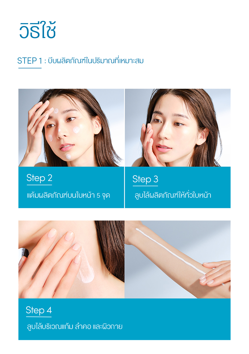 วิธีใช้ เกลี่ยผลิตภัณฑ์ให้ทั่วใบหน้าและลำคอหลังการบำรุงผิวในตอนเช้า และลูบไล้ให้ทั่วผิวกายก่อนออกแดดเป็นประจำทุกวัน สามารถล้างออกด้วยผลิตภัณฑ์ทำความสะอาดผิวทั่วไป
