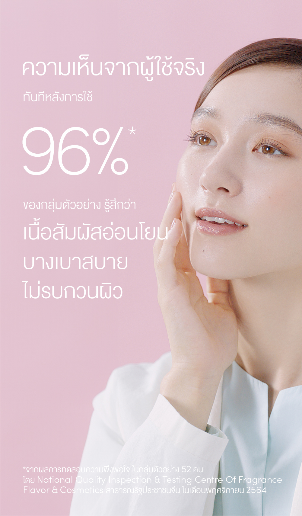 *จากผลการทดสอบทางคลินิกในกลุ่มตัวอย่าง 25 คน และจากผลการทดสอบความพึงพอใจ ในกลุ่มตัวอย่าง 50 คน โดย National Quality Inspection & Testing Centre Of Fragrance Flavor & Cosmetics สาธารณรัฐประชาชนจีน ในเดือนพฤศจิกายน 2564