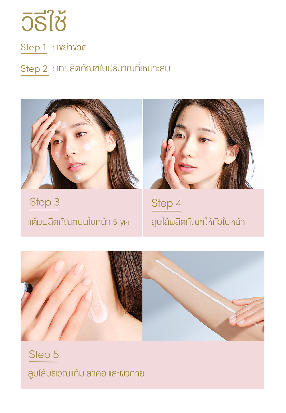 วิธีใช้ เขย่าขวดก่อนใช้ เกลี่ยผลิตภัณฑ์ให้ทั่วใบหน้าและลำคอหลังการบำรุงผิวในตอนเช้า และลูบไล้ให้ทั่วผิวกายก่อนออกแดดเป็นประจำทุกวัน สามารถล้างออกด้วยผลิตภัณฑ์ทำความสะอาดผิวทั่วไป