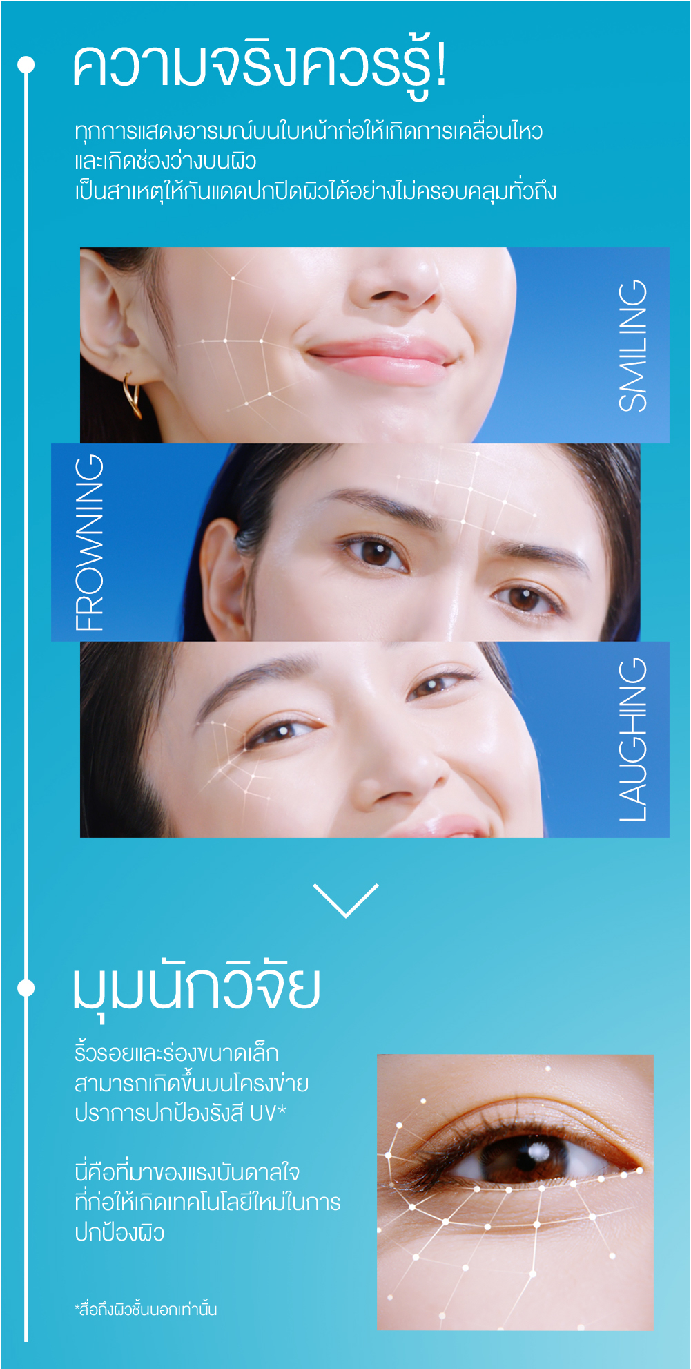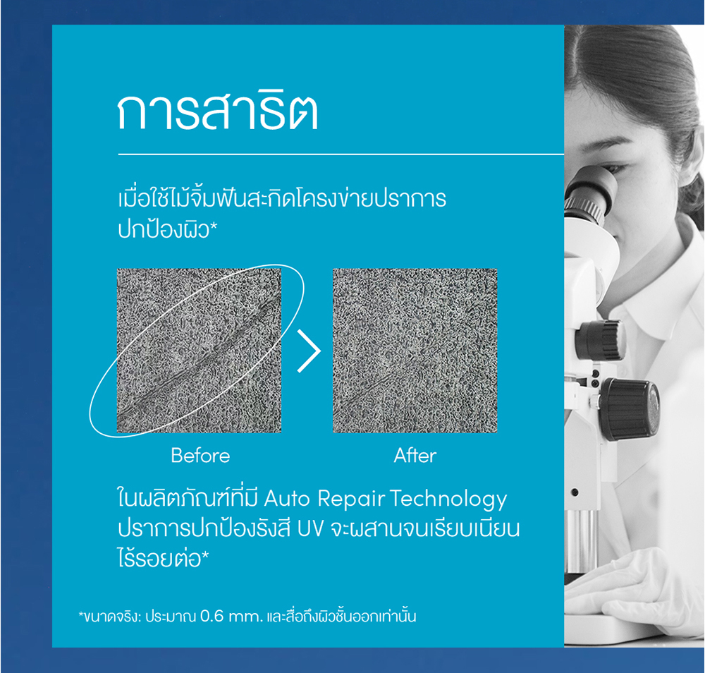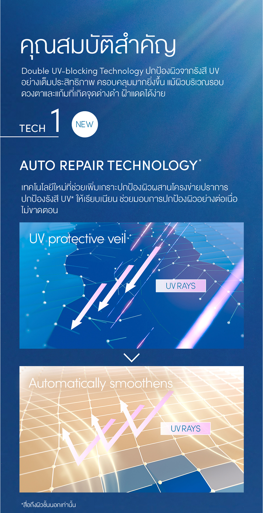 ● Auto Repair Technology ปกป้องผิวจากรังสี UV ที่เป็นอันตรายต่อผิวอย่างมีประสิทธิภาพและ ครอบคลุมมากยิ่งขึ้น ถึงผิวบริเวณรอบดวงตา และแก้มที่เกิดจุดด่างดำได้ง่าย