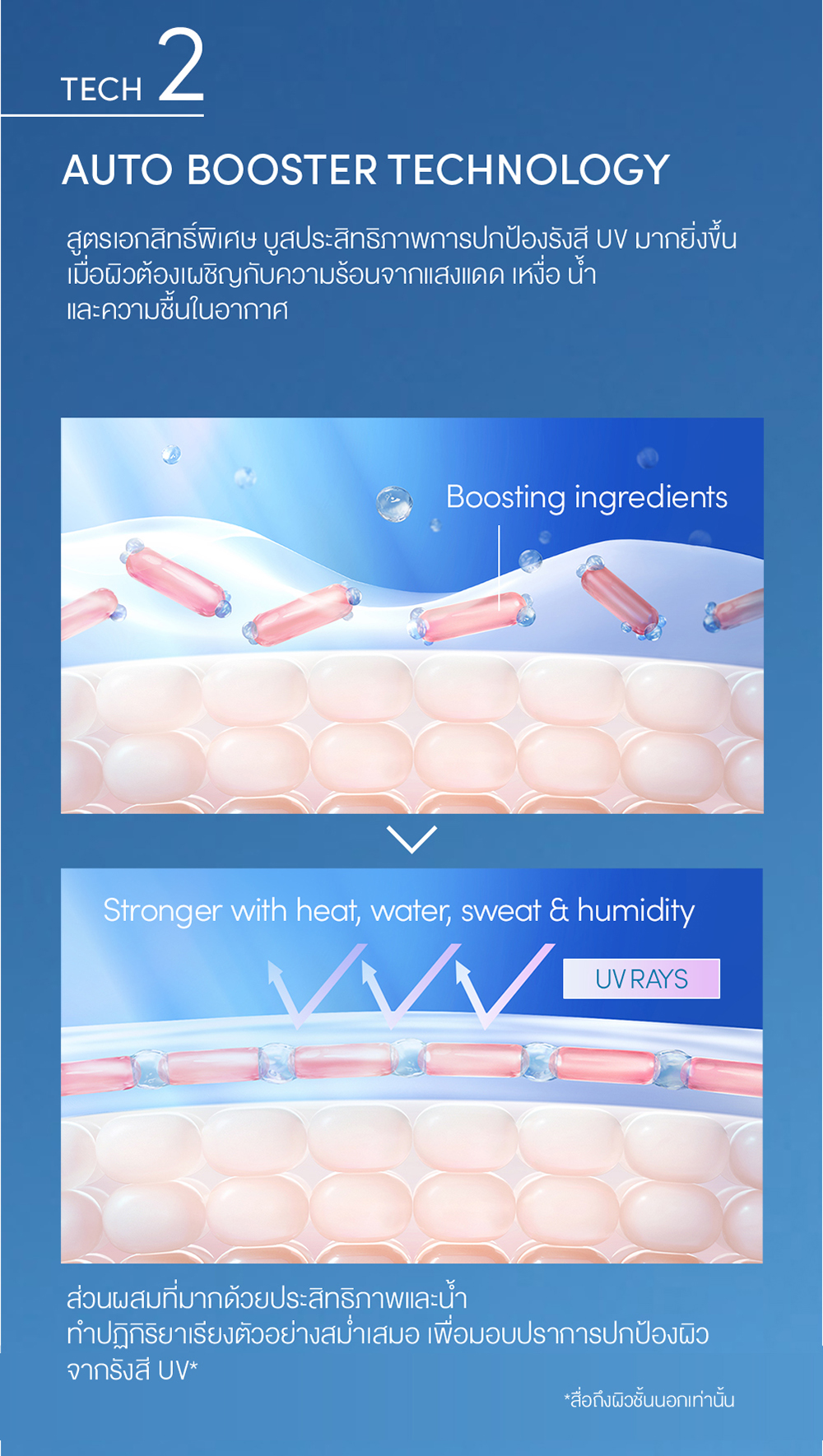 ● Auto Booster Technology เพิ่มประสิทธิภาพการปกป้องผิวจากแสงแดดและรังสี UV มากยิ่งขึ้น เมื่อผิวสัมผัสกับความร้อนเหงื่อ น้ำ และความชื้นในอากาศ