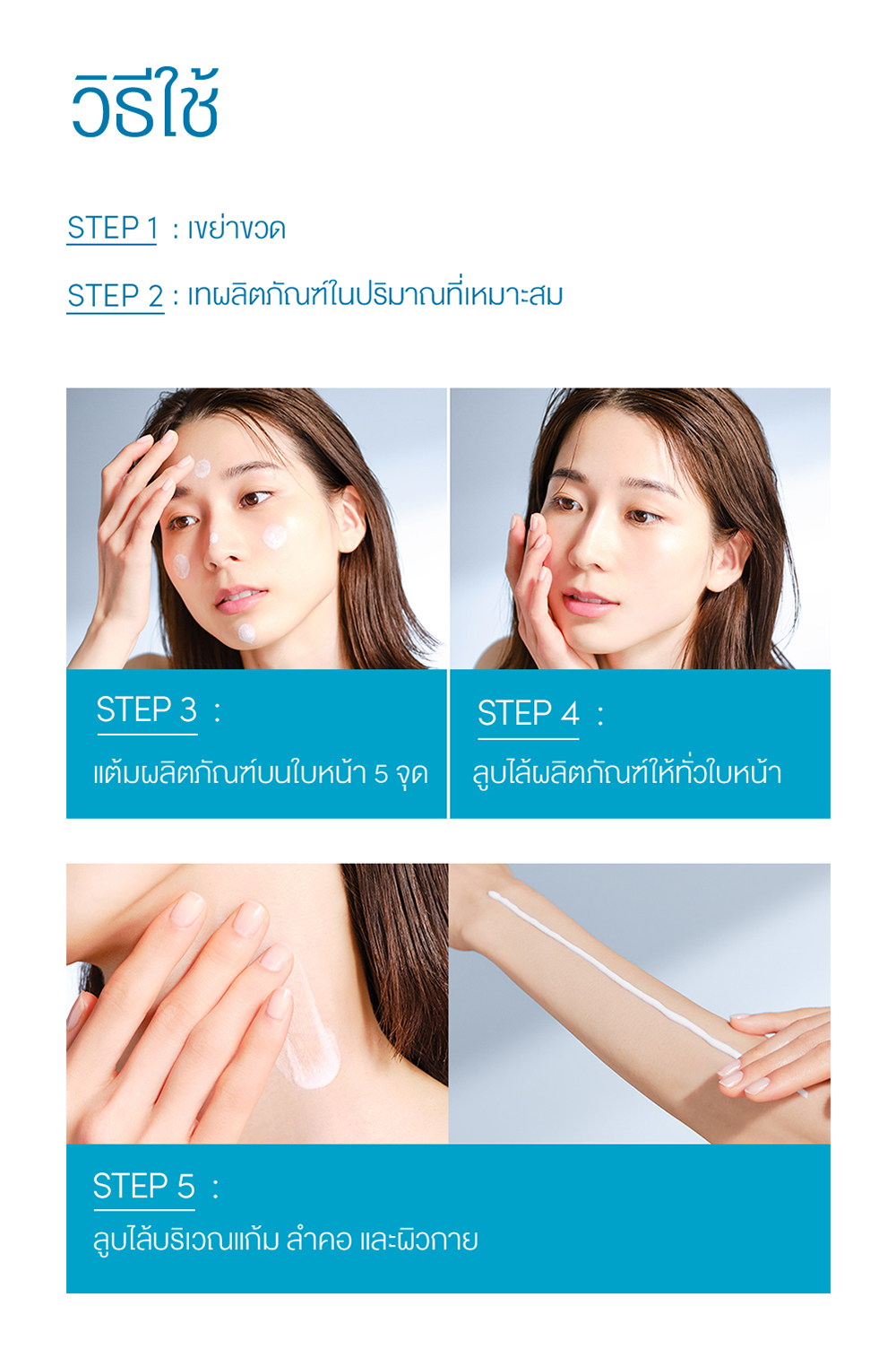 วิธีใช้ เขย่าขวดก่อนใช้ เกลี่ยผลิตภัณฑ์ให้ทั่วใบหน้าและลำคอหลังการบำรุงผิวในตอนเช้า และลูบไล้ให้ทั่วผิวกายก่อนออกแดดเป็นประจำทุกวัน สามารถล้างออกด้วยผลิตภัณฑ์ทำความสะอาดผิวทั่วไป