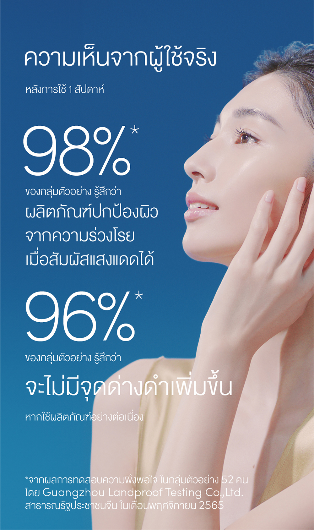 *จากผลการทดสอบทางคลินิก ในกลุ่มตัวอย่าง 27 คน โดย Guangzhou Landproof Testing Co.,Ltd. สาธารณรัฐประชาชนจีน ในเดือนธันวาคม 2565