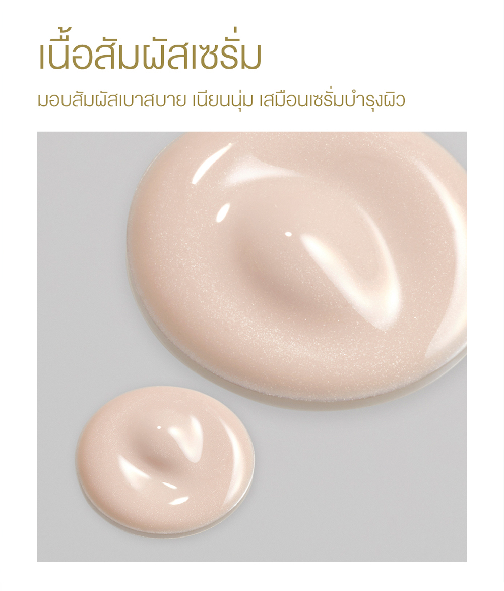 - เนื้อสีชมพูอ่อนมีคุณสมบัติโทนอัพผิว ให้ผิวแลดูกระจ่างใสอมชมพูอย่างเป็นธรรมชาติ