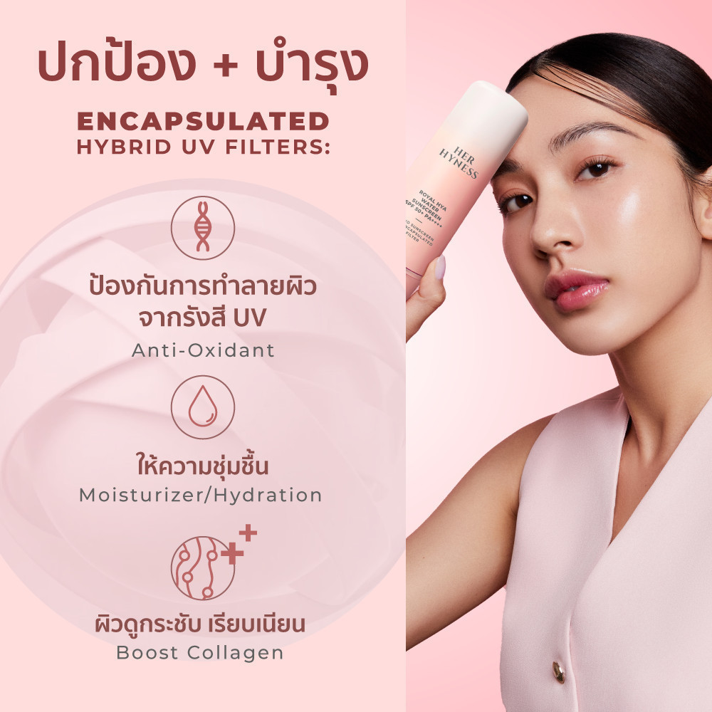 ด้วยคุณสมบัติทั้งหมดนี้ HER HYNESS ROYAL HYA WATER SUNscreen จึงไม่ใช่แค่กันแดด แต่เป็นสกินแคร์ที่ช่วยปกป้อง บำรุง และฟื้นฟูผิวของคุณไปพร้อมๆ กัน ทำให้ผิวของคุณแข็งแรง สุขภาพดี และดูอ่อนเยาว์อยู่เสมอ นี่คือการลงทุนที่คุ้มค่าสำหรับผิวของคุณในระยะยาว