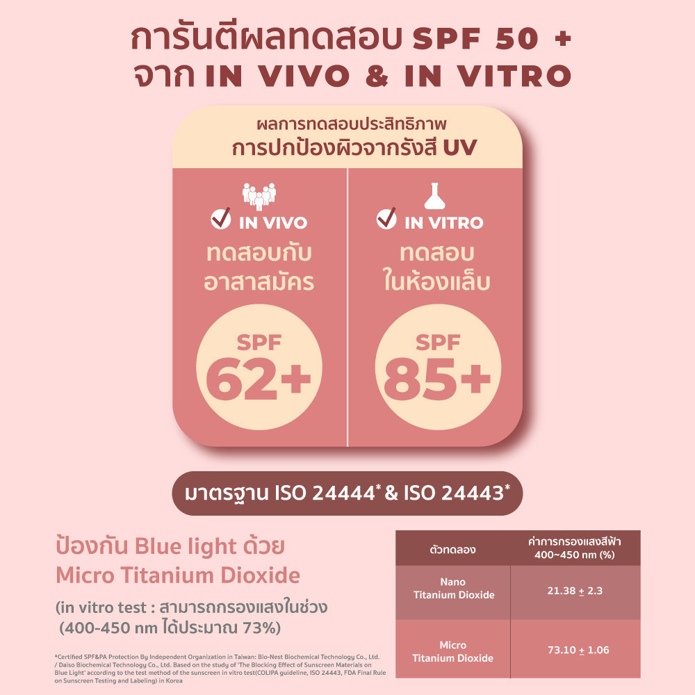 - In Vivo tested SPF62+ : มีการทดสอบ SPF ในอาสาสมัคร In Vivo ตามมาตรฐาน ISO24444 / 2019 จาก PRINCETON CONSUMER RESEARCH แล็บการทดสอบเครื่องสำอางจากประเทศอังกฤษ