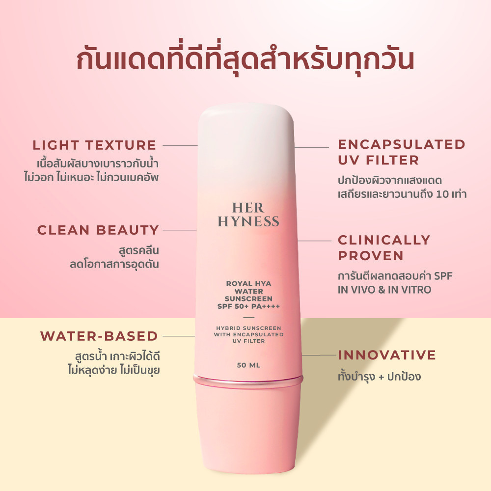 คุณอาจจะคิดว่ากันแดดก็เหมือนๆ กันหมด แต่บอกเลยว่า HER HYNESS ROYAL HYA WATER SUNSCREEN SPF50+ PA++++ 50 ML มีเหตุผลที่ทำให้คุณต้องตัดสินใจซื้อและไม่เสียดายเงินที่จ่ายไปแน่นอน! นี่คือกันแดดที่ได้รับการพัฒนามาอย่างพิถีพิถัน เพื่อให้ตอบโจทย์ความต้องการของผู้บริโภคในทุกมิติ ไม่ว่าจะเป็นประสิทธิภาพการปกป้อง ความสบายในการใช้งาน หรือแม้แต่การบำรุงผิวไปในตัว เหตุผลแรกและสำคัญที่สุดคือ ประสิทธิภาพการปกป้องที่เหนือกว่า ในโลกที่รังสี UV มีความรุนแรงขึ้นทุกวัน การมีกันแดดที่มีค่า SPF และ PA สูงสุดเป็นสิ่งจำเป็นอย่างยิ่ง HER HYNESS ไม่เพียงแค่มีค่าปกป้องที่สูง แต่ยังเป็นกันแดดแบบ Hybrid Sunscreen ที่รวมเอาข้อดีของกันแดดเคมี (ที่ซึมซาบเร็ว ไม่ทิ้งคราบ) และกันแดดกายภาพ (ที่อ่อนโยนต่อผิว) เข้าไว้ด้วยกัน ทำให้ได้การปกป้องที่เสถียรและครอบคลุม ไม่ต้องกังวลเรื่องการแพ้หรือประสิทธิภาพที่ลดลงระหว่างวัน
