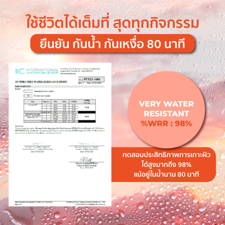 - Photostability: สารกันแดดที่เลือกใช้มีความเสถียรสูงเมื่อโดนแสงแดด ทำให้ประสิทธิภาพในการป้องกันไม่ลดลงง่ายๆ ตลอดระยะเวลาที่ทา