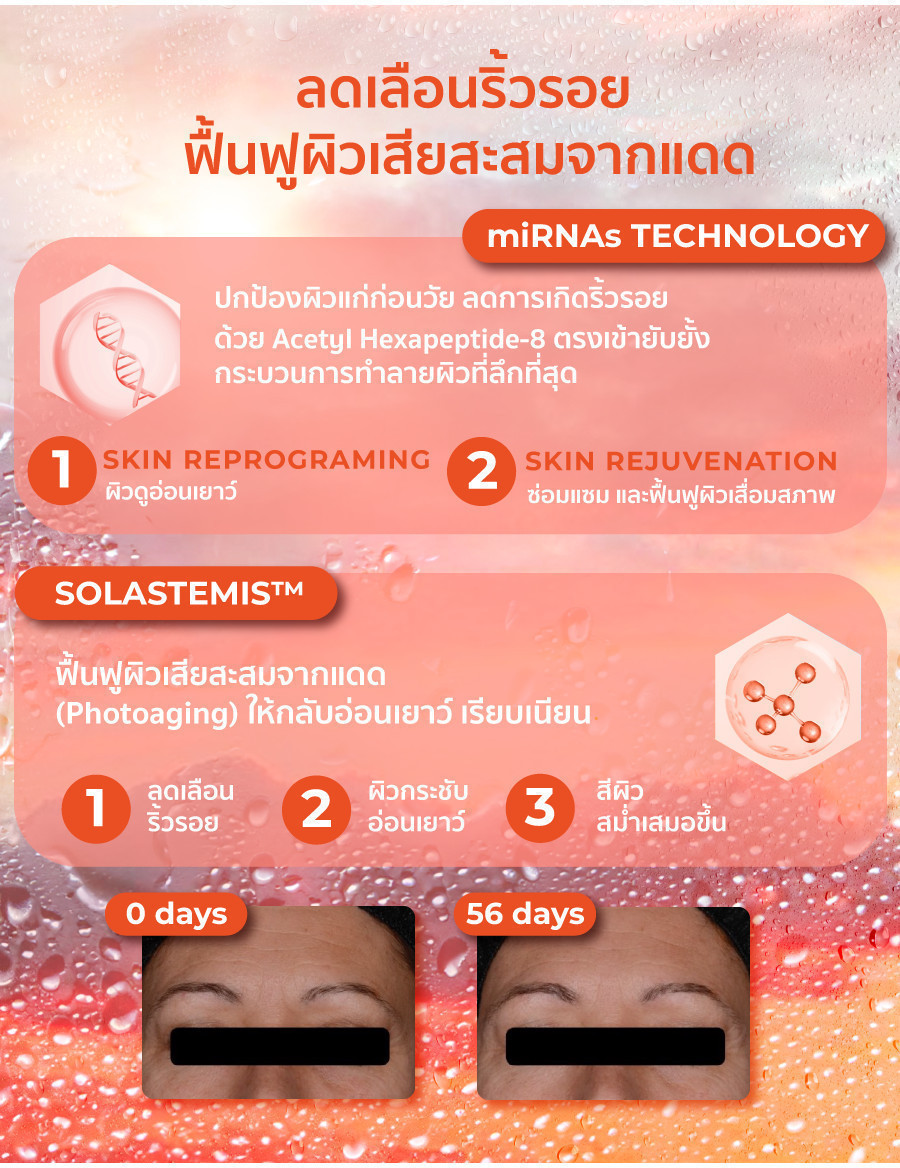 - miRNAs Technology: ฟื้นฟูผิวล้ำลึกถึงระดับ miRNAs สร้างเซลล์ผิวใหม่ + ซ่อมแซมเซลล์ผิวเก่า ลดเลือนริ้วรอย เพื่อผิวเรียบเนียน กระจ่างใส และอ่อนเยาว์