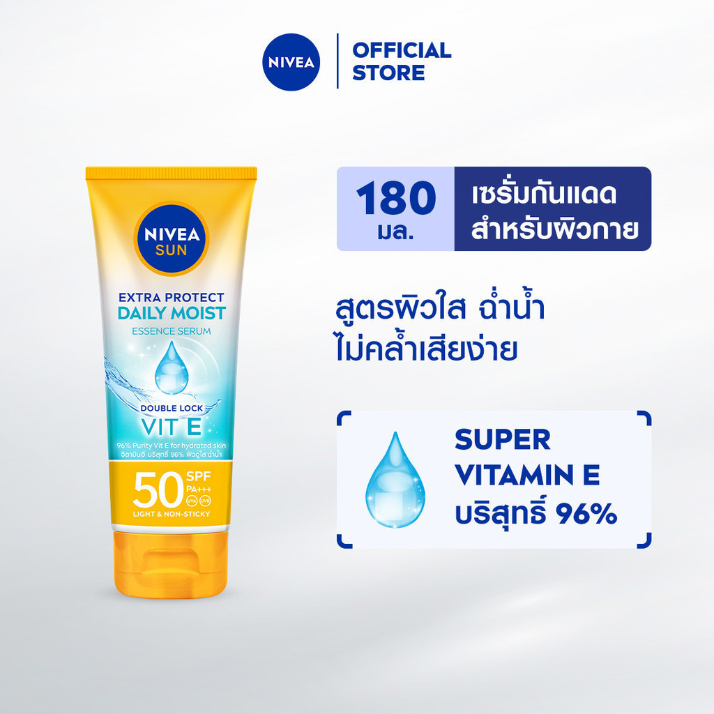 นีเวีย ซัน ซูเปอร์ โพรเท็ค เดลี่ มอยส์ ซัน บอดี้ เซรั่ม เอสพีเอฟ50 พีเอ+++ เป็นเซรั่มกันแดดสำหรับผิวกายที่ออกแบบมาเพื่อการใช้งานในชีวิตประจำวัน โดดเด่นด้วยสูตร SPF&UV Essence + Super Vitamin E ที่ไม่ใช่แค่ป้องกันแดด แต่ยังช่วยบำรุงผิวอย่างล้ำลึก สาร Super Vitamin E บริสุทธิ์ 96% เป็นจุดเด่นสำคัญที่ช่วย เพิ่มความชุ่มชื่นให้ผิว ทำให้ ผิวอิ่มน้ำ ดูสุขภาพดี งานวิจัยทางวิทยาศาสตร์พบว่า วิตามินอีเป็นสารต้านอนุมูลอิสระที่มีประสิทธิภาพสูง ช่วยปกป้องเซลล์ผิวจากความเสียหายที่เกิดจากรังสียูวีและมลภาวะ ช่วยลดการอักเสบและเสริมสร้างเกราะป้องกันผิว ทำให้ ผิวชุ่มชื่น และยืดหยุ่นมากขึ้น
