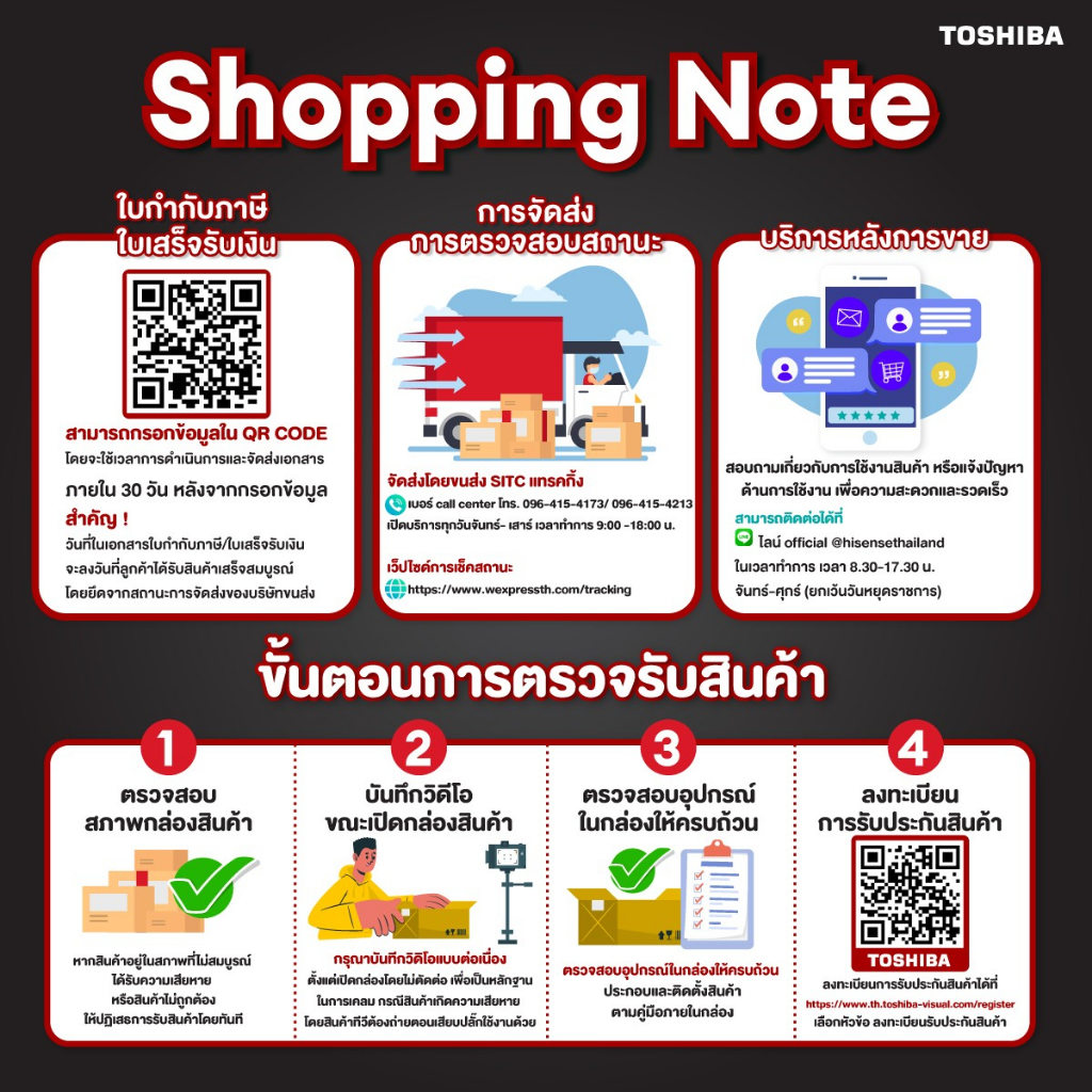 สอบถามข้อมูลเพิ่มเติม Customer Service Online : (วันจันทร์ - ศุกร์ เวลา 09.00 – 18.00 น. เว้นวันหยุดราชการ) หมายเหตุ: รับเคลมสินค้าเมื่อมีหลักฐานจากการถ่ายวิดีโอก่อนแกะสินค้าเท่านั้น และทางบริษัทไม่มีบริการยกสินค้าขึ้นชั้นบน