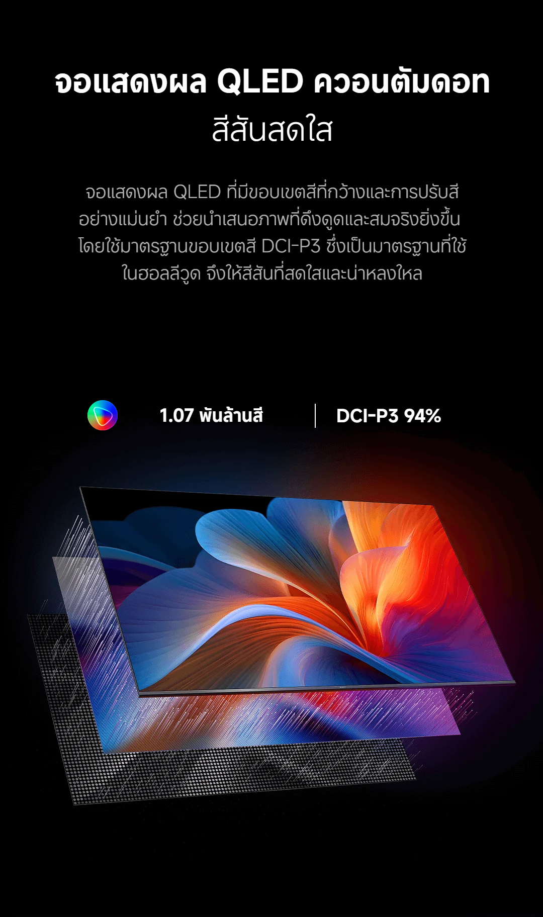 | เทคโนโลยีจอภาพ | LED มาตรฐาน | ✅ QLED (Quantum Dot): ให้ขอบเขตสีที่กว้างและสมจริงกว่า |
