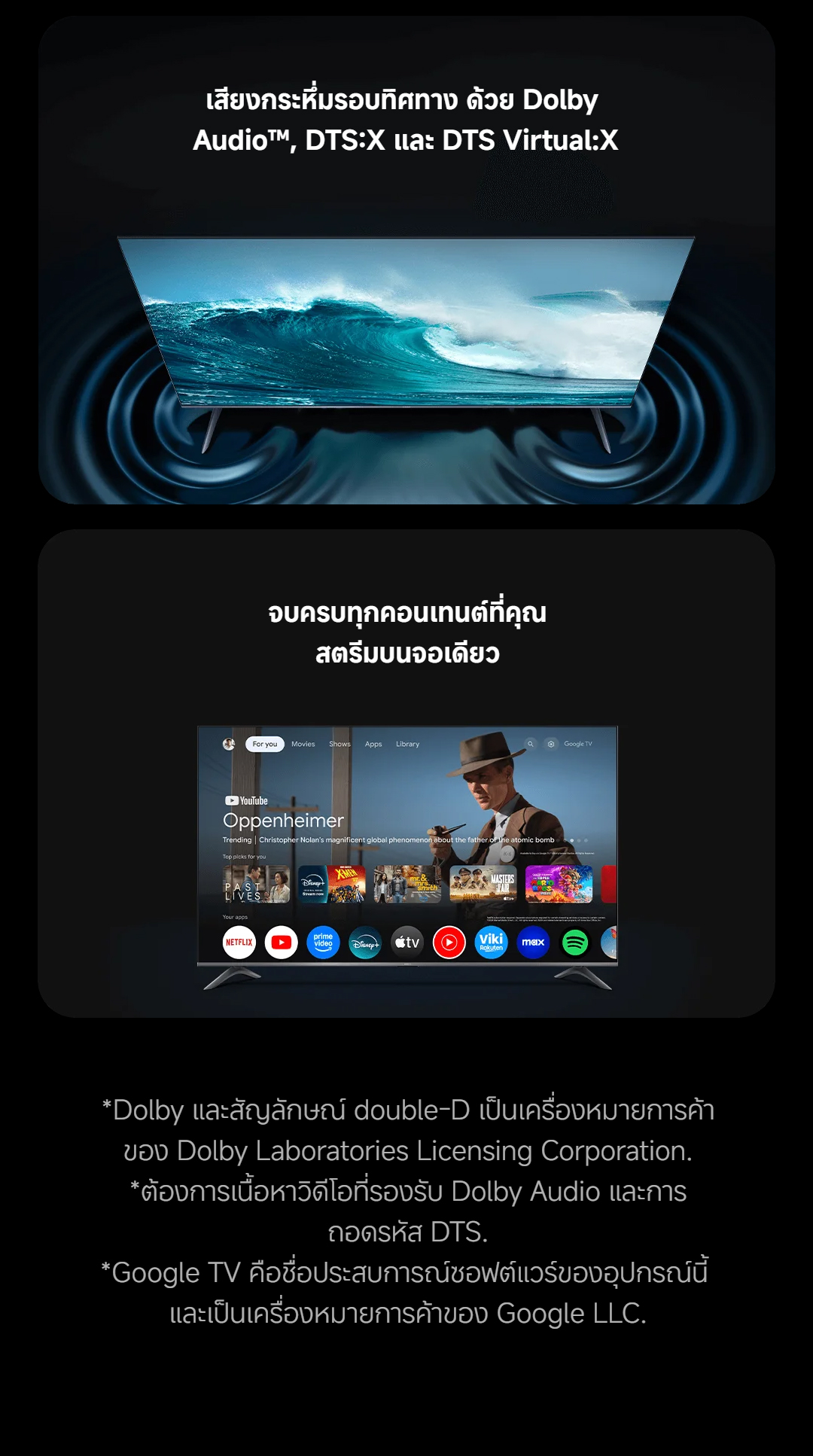 | แอปพลิเคชันที่รองรับ | Netflix, YouTube, Prime Video, และอื่นๆ ผ่าน Google Play Store |