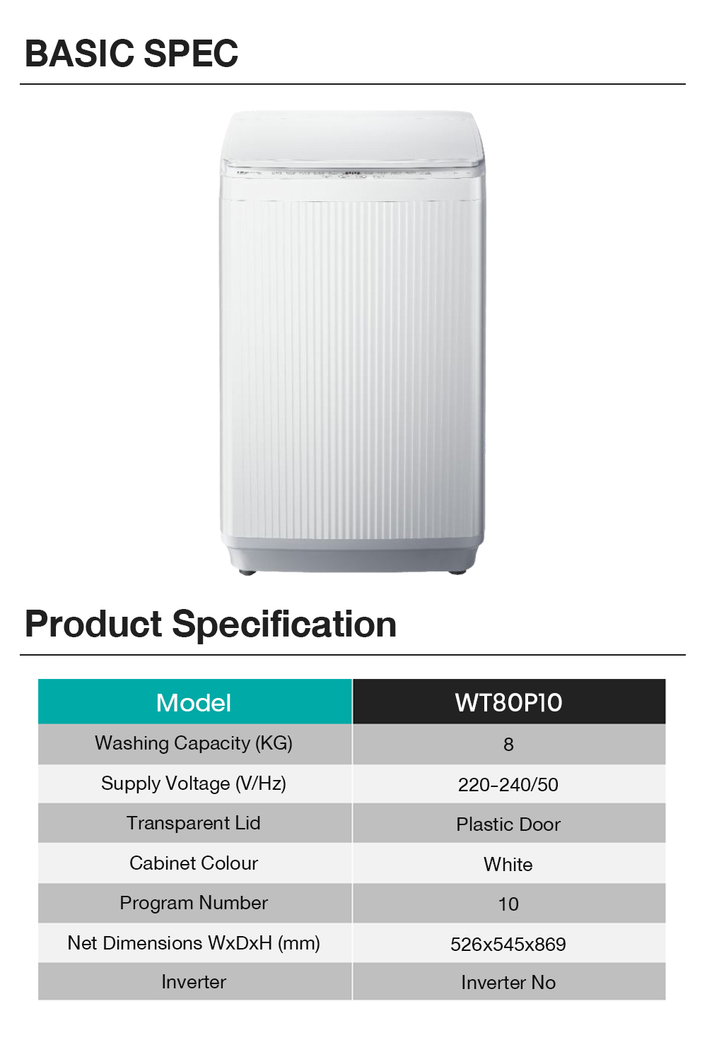 | WT80P10-8KG | 8 | 532 x 543 x 920 | ไม่มีช่องใส่น้ำยาปรับผ้านุ่ม |