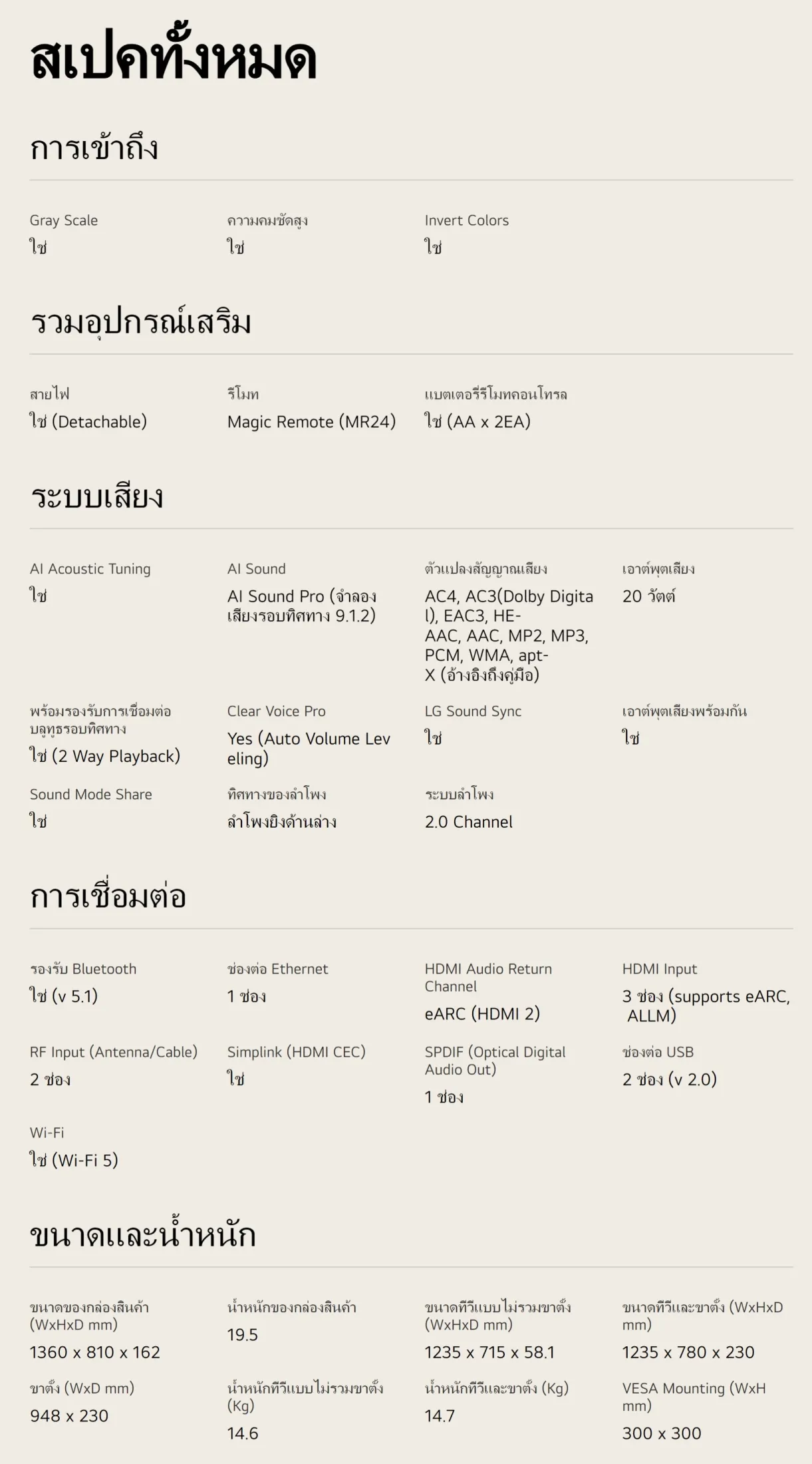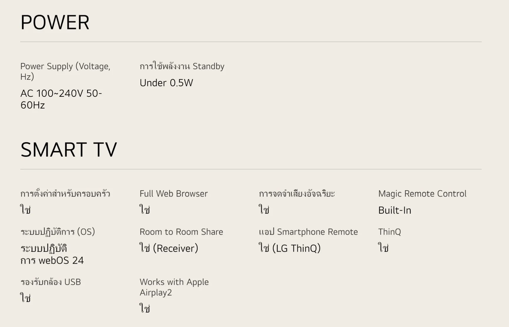 ****LG รองรับอุปกรณ์ Wi-Fi 'สำคัญ' บริการและคุณสมบัติที่รองรับ 'สำคัญ' อาจแตกต่างกันไปขึ้นอยู่กับอุปกรณ์ที่เชื่อมต่อ การเชื่อมต่อเริ่มต้นสำหรับ ThinQ และ Matter ควรดำเนินการผ่านแอปมือถือ ThinQ